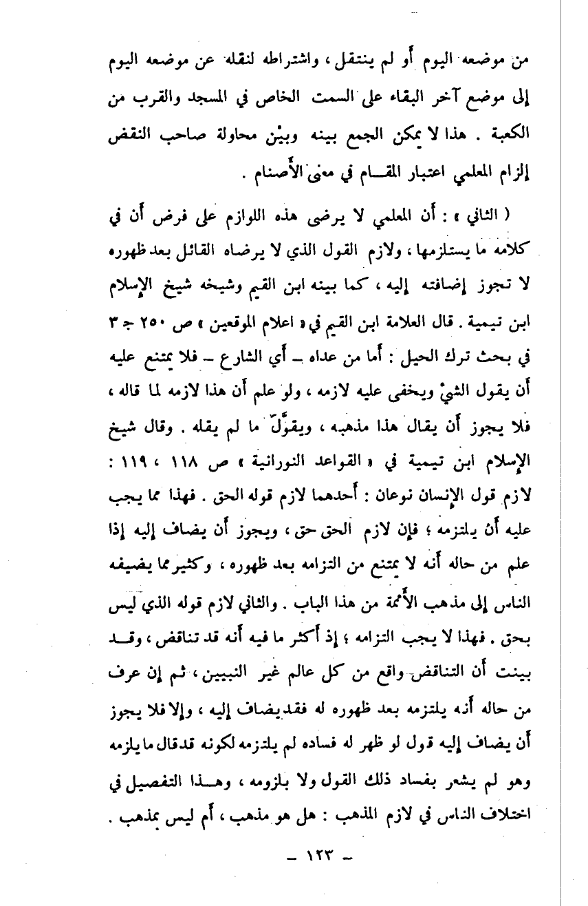 "الثاني": أن المعلمي لا يرضى هذه اللوازم على فرض أن في كلامه ما يستلزمها. ولازم القول الذي لا يرضاه القائل بعد ظهوره لا تجوز إضافته إليه. كما بينه ابن القيم وشيخه شيخ الإسلام ابن تيمية. قال العلامة ابن القيم في "اعلام الموقعين" ص250 ج3 في بحث ترك الحبل: أما من عداه - أي الشارع - فلا يمنع عليه أن يقول الشيء ويخفى عليه لازمه. ولو علم أن هذا لازمه لما قاله، فلا يجوز أن يقال هذا مذهبه، ويقول ما لم يقله. وقال شيخ الإسلام ابن تيمية في "القواعد النورانية" ص118، 119: لازم قول الإنسان نوعان: أحدهما لازم قوله الحق. فهذا مما يجب عليه أن يلتزمه، فإن لازم الحق حق، ويجوز أن يضاف إليه إذا علم من حاله أنه لا يمتنع من التزامه بعد ظهوره. وكثير مما يضيفه الناس إلى مذهب الأئمة من هذا الباب. والثاني لازم قوله الذي ليس بحق. فهذا لا يجب التزامه، إذ أكثر ما فيه أنه قد تناقض، وقد بينت أن التناقض واقع من كل عالم غير النبيين: ثم إن عرف من حاله أنه يلتزمه بعد ظهوره له فقد يضاف إليه، وإلا فلا يجوز أن يضاف إليه قول لو ظهر له فساده لم يلتزمه لكونه قد قال ما يلزمه وهو لم يشعر بفساد تلك القول ولا بلزومه. وهذا التفصيل في اختلاف الناس في لازم المذهب: هل هو مذهب، أم ليس بمذهب.