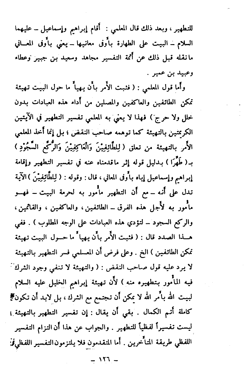 وأما قول المعلمي: (فثبت الأمر بأن يهيأ ما حول البيت تهيئة تمكن الطائفين والعاكفين والمصلين من أداء هذه العبادات بدون خلل ولا حرج) فهذا لا يعني به المعلمي تفسير التطهير في الآيتين الكريمتين بالتهيئة كما توهمه صاحب النقض؛ بل إنما أخذ المعلمي الأمر بالتهيئة كما توهمه صاحب النقض؛ بل إنما أخذ المعلمي الأمر بالتهيئة من تعلق (للطائفين والعاكفين والركع السجود) بـ (طهرا) بدليل قوله إثر ما قدمناه عنه في تفسير التطهير وإقامة إبراهيم وإسماعيل إياه بأوفى المعاني، قال: وقوله: (للطائفين) الآية تدل على أنه - مع أن التطهير مأمور به لحرمة البيت - فهو مأمور به لأجل هذه الفرق - الطائفين، والعاكفين، والقائمين، والركع السجود - لتؤدي هذه العبادات على الوجه المطلوب) . ففي هذا الصدد قال: (فثبت الأمر أن المعلمي فسر التطهير بالتهيئة لا يرد عليه قول صاحب النقض: (والتهيئة لا تنفي وجود الشرك فيه المأمور بتطهيره منه) لأن تهيئة إبراهيم الخليل عليه السلام لبيت الله بامر الله لا يمكن أن تجتمع مع الشرك، بل لابد أن تكون كاملة أتم الكمال. بقي أن يقال: إن تفسير التطهير بالتهيئة ليست تفسيرًا لفظيًا للتطهير. والجواب عن هذا أن التزام التفسير اللفظي طريقة المتأخرين. أما المتقدمون فلا يلتزمون التفسير اللفظي