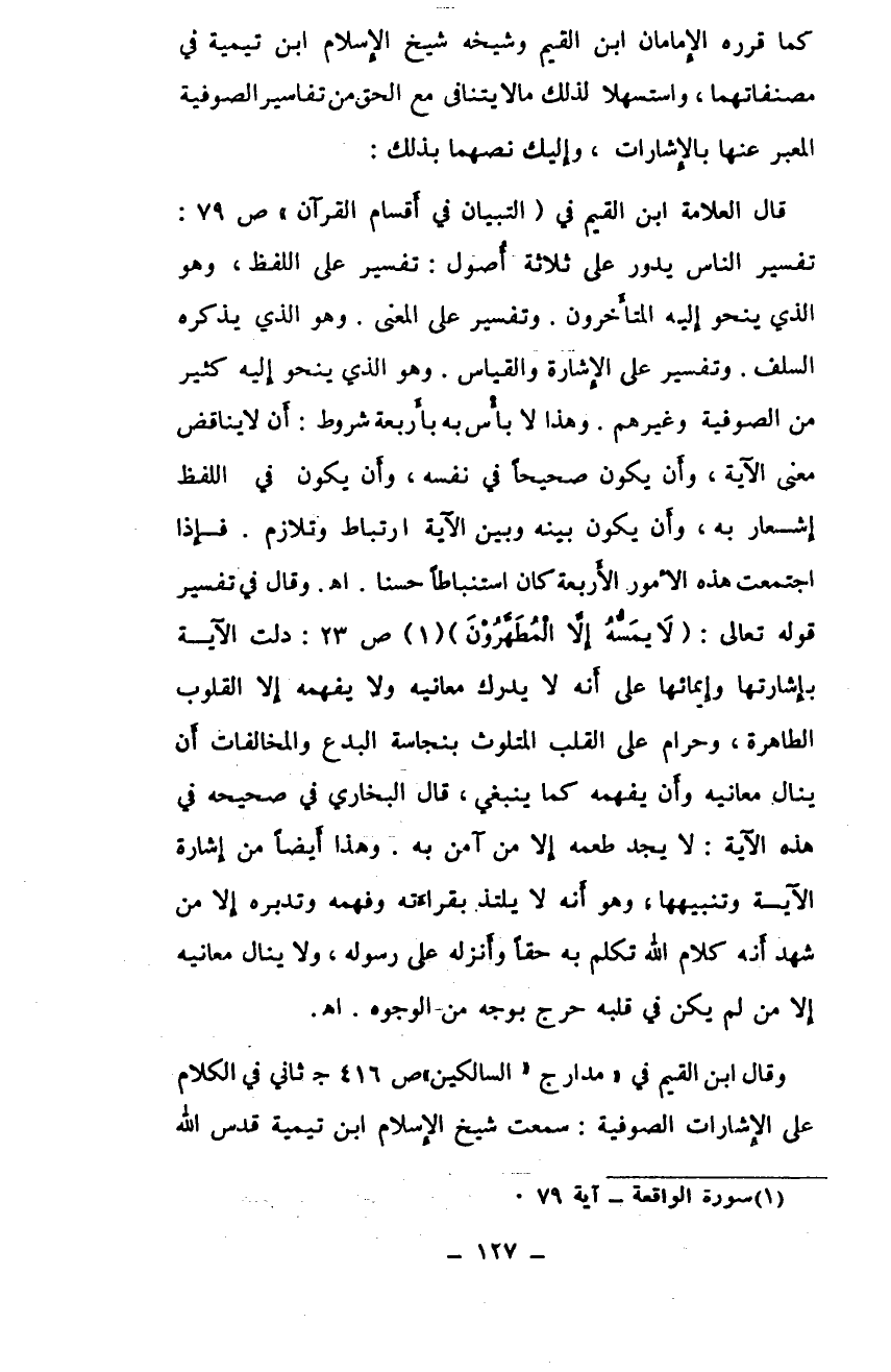 قال العلامة ابن القيم في "التبيان في أقسام القرآن" ص79: تفسير الناس يدور على ثلاثة أصول: تفسير على اللفظ، وهو الذي ينحو إليه المتأخرون. وتفسير على المعنى. وهو الذي يذكره السلف. وتفسير على الإشارة والقياس. وهو الذي ينحو إليه كثير من الصوفية وغيرهم. وهذا لا بأس به بأربعة شروط: أن لا يناقض معنى الآية، وأن يكون صحيحًا في نفسه، وأن يكون في اللفظ إشعار به، وأن يكون بينه وبين الآية ارتباط وتلازم. فإذا اجتمعتت هذه الأمور الأربعة كان استنباطًا حسنًا. أهـ. وقال في تفسير قوله تعالى: (لا يمسه إلا المطهرون) (¬1) ص23: دلت الآية بإشارتها وإيمائها على أنه لا يدرك معانيه ولا يفهمه إلا القلوب الطاهرة، وحرام على القلب المتلوث بنجاسة البدع والمخالفات أن ينال معانيه وأن يفهمه كما ينبغي، قال البخاري في صحيحه في هذه الآية: لا يجد طعمه إلا من آمن به. وهذا أيضًا من إشارة الآية وتنبيهها، وهو أنه لا يلتذ بقراءته وفهمه وتدبره إلا من شهد أنه كلام الله تكلم به حقًا وأنزله على رسوله، ولا ينال معانيه إلا من لم يكن في قلبه حرج بوجه من الوجود. أهـ.
