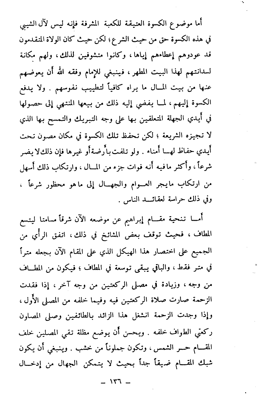 أما موضوع الكسوة العتيقة للكعبة المشرفة فإنه ليس لآل الشيبي في هذه الكسوة حق من حيث الشرع، لكن حيث كان الولاة المتقدمون قد عودوهم إعطاءهم إياها. وكانوا متشوفين لذلك، ولهم مكانة لدانتهم لهذا البيت المطهر، فينبغي للإمام وفقه الله أن يعوضهم عنها من بيت المال ما يراه كافيًا لتطيب نفوسهم. ولا يدفع الكسوة إليهم، لما يفضي إليه ذلك من بيعها المنتهي إلى حصولها في أيدي الجهلة المتعلقين بها على وجه التبريك والتمسح بها الذي لا تجيزه الشريعة، لكن تحفظ تلك الكسوة في مكان مصون تحت أيدي حفاظ لها أمناء. ولو تلفت بأرضه أو غيرها فإن ذلك لا يضر شرعًا، وأكثر ما فيه أنه فوات جزء من المال. وارتكاب ذلك أسهل من ارتكاب ما يجر العوام والجهال إلى ما هو محظور شرعًا. وفي ذلك حراسة لعقائد الناس.