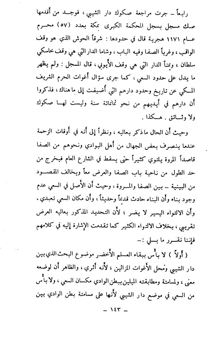 وحيث أن الحال ما ذكر بعاليه، ونظرًا إلى أنه في أوقات الزحمة عندما ينصرف بعض الجهال من أهل البوادي ونحوهم من الصفا قاصدًا المروة يلتوي كثيرًا حتى يسقط في الشارع العام فيخرج من حد الطول من ناحية باب الصفا والعرض معًا ويخالف المقصود من البينية - بين الصفا والمروة. وحيث أن الأصل في السعي عدم وجود بناء وأن البناء حادث قديمًا وحديثًا. وأن مكان السعي تعبدي، وأن الالتواء اليسير لا يضر، لأن التحديد المذكور بعاليه العرض تقريبي، بخلاف الالتواء الكثير كما تقدمت الإشارة إليه في كلامهم فإننا نقرر ما يلي: