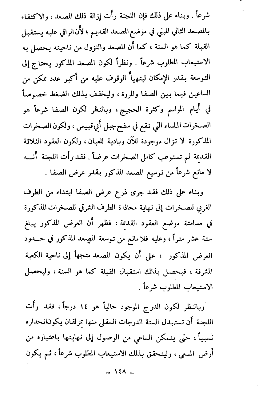 شرعًا. وبناء على ذلك فإن اللجنة رأت إزالة ذلك المسعد، والاكتفاء بالمصعد الثاني المبني في موضع المصعد القديم، لأن الراقي عليه يستقبل القبلة كما هو السنة، كما أن المصعد والنزول من ناحيته يحصل به الاستيعاب المطلوب شرعًا. ونظرًا لكون المصعد المذكور يحتاج إلى التوسعة بقدر الإمكان ليتهيأ الوقوف عليه من أكبر عدد ممكن من الساعين فيما بين الصفا والمروة، وليخفف بذلك الضغط خصوصًا في أيام المواسم وكثرة الحجيج، وبالنظر لكون الصفا شرعًا هو الصخرات الملساء التي تقع في سفح جبل أبي قبيس، ولكون الصخرات المذكورة لاتزال موجودة للآن وبادية للعيان، ولكون العقود الثلاثة القديمة لم تستوعب كامل الصخرات عرضًا. فقد رأت اللجنة أنه لا مانع شرعًا من توسيع المصعد المذكور بقدر عرض الصفا.