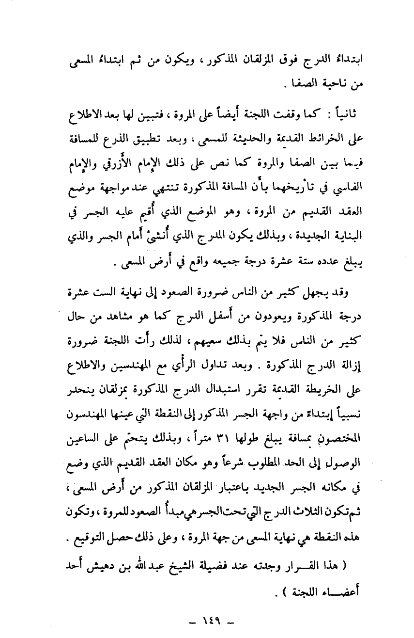 ثانيًا: كما وقفت اللجنة أيضًا على المروة، فتبين لها بعد الاطلاع على الخرائط القديمة والحديثة للمسعى، وبعد تطبيق الذرع للمسافة فيما بين الصفا والمروة كما نص على ذلك الإمام الأزرقي والإمام الفاسي في تأريخهما بأن المسافة المذكورة تنتهي عند مراجعة موضع العقد القديم من المروة، وهو الموضع الذي أقيم عليه الجسر في البناية الجديدة، وبذلك يكون المدرج الذي أنشيء أمام الجسر والذي يبلغ عدده ستة عشرة درجة جميعه واقع في أرض المسعى.