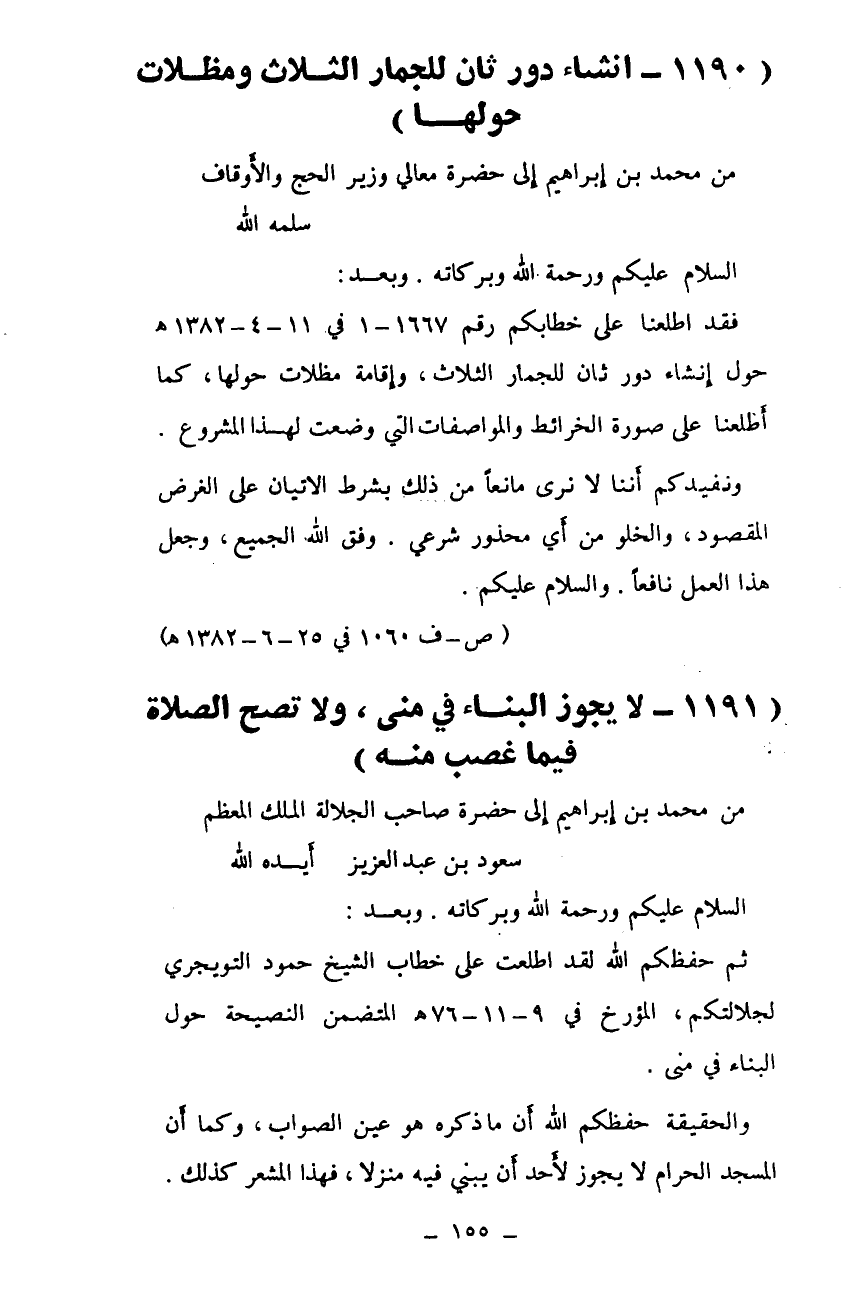 فقد اطلعنا على خطابكم رقم 1667 - 1 في 11/4/1382هـ حول إنشاء دور ثان للجمار الثلاث، وإقامة مظلات حولها، كما أطلعنا على صورة الخرائط والمواصفات التي وضعت لهذا المشروع.