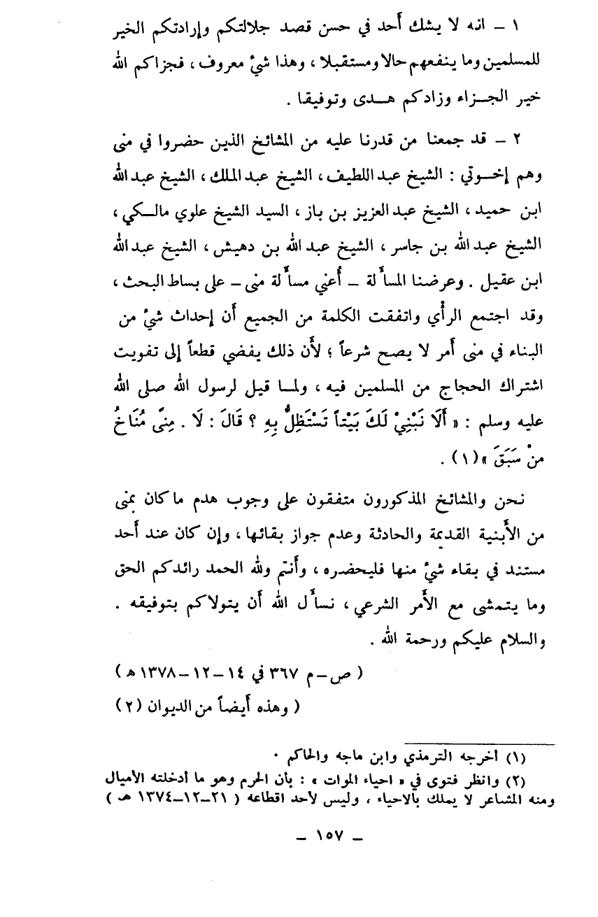 نحن والمشائخ المذورون متفقون على وجوب هدم ما كان بمنى من الأبنية القديمة والحادثة وعدم جواز بقائها، وإن كان عند أحد مستند في بقاء شيء منها فليحضره، وأنتم ولله الحمد رائدكم الحق وما يتمشى مع الأمر الشرعي، نسأل الله أن يتولاكم بتوفيقه. والسلام عليكم ورحمة الله.