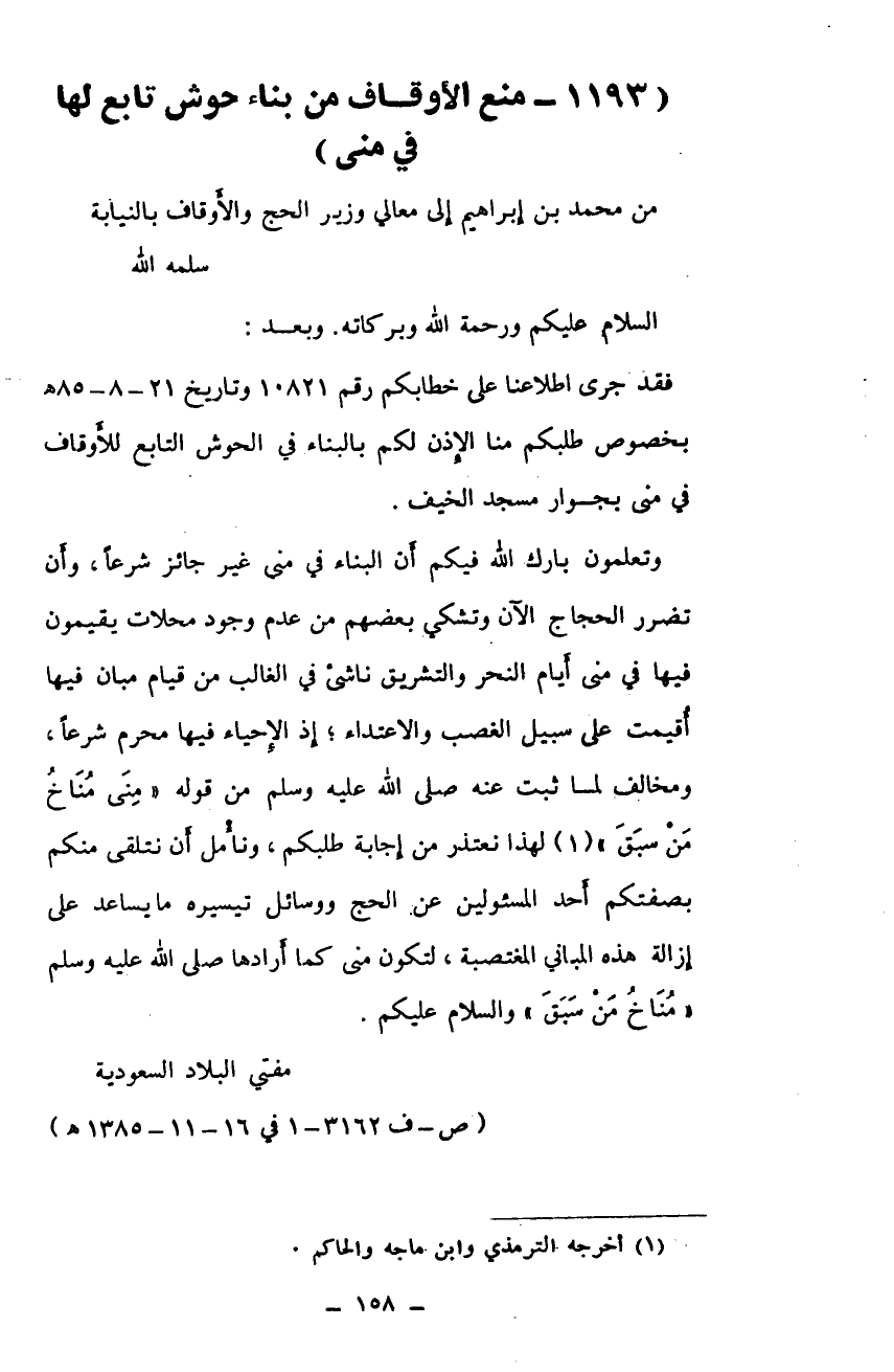 وتعلمون بارك الله فيكم ان البناء في منى غير جائز شرعًا، وأن تضرر الحجاج الآن وتشكي بعضهم من عدم وجود محلات يقيمون فيها في منى ايام النحر والتشريق ناشيء في الغالب من قيام مبان فيها أقيمت على سبيل الغصب والاعتداء، إذ الإحياء فيها محرم شرعًا، ومخالف لما ثبت عنه صلى الله عليه وسلم من قوله "منى مناخ من سبق" (¬1) لهذا تعتذر من إجابة طلبكم، وتأمل أن نتلقى منكم بصفتكم أحد المسئولين عن الحج ووسائل تيسيره ما يساعد على إزالة هذه المباني المغتصبة، لتكون منى كما أرادها صلى الله عليه وسلم "مناخ من سبق" والسلام عليكم.