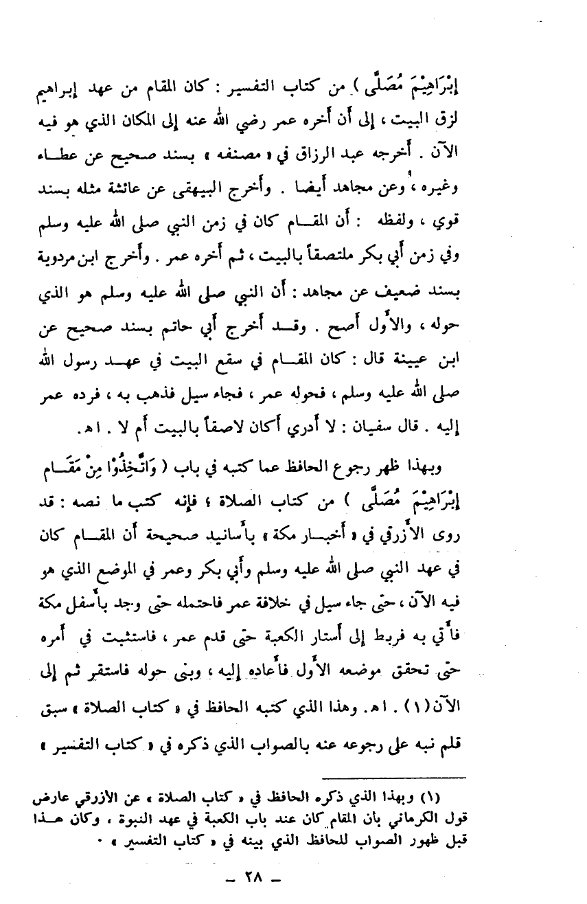 وبهذا ظهر رجوع الحافظ عما كتبه في باب (واتخذوا من مقام إبراهيم مصلى) من كتاب الصلاة؛ فإنه كتب ما نصه: قد روى الأزرقي في "أخبار مكة" بأسانيد صحيحة أن المقام كان في عهد النبي صلى الله عليه وسلم وأبي بكر وعمر في الموضع الذي هو فيه الآن، حتى جاء سيل في خلافة عمر فاحتمله حتى وجد بأسفل مكة فأتى به فربط إلى أستار الكعبة حتى قدم عمر، فاستثبت في أمره حتى تحقق موضعه الأول فأعاده إليه، وبنى حوله فاستقر ثم إلى الآن (¬1) . أهـ. وهذا الذي كتبه الحافظ في "كتاب الصلاة" سبق قلم نبه على رجوعه عنه بالصواب الذي ذكره في "كتاب التفسير"