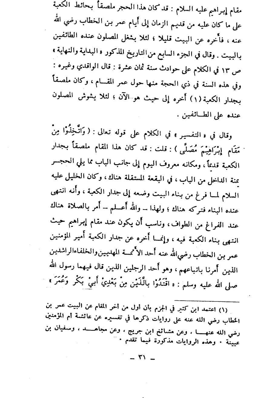 مقام إبراهيم عليه السلام: قد كان هذا الحجر ملصقًا بحائط الكعبة على ما كان عليه من قديم الزمان إلى أيام عمر بن الخطاب رضي الله عنه. فأخره عن البيت قليلاً؛ لئلا يشغل المصلون عنده الطائفين بالبيت. وقال في الجزء السابع من التاريخ المذكور "البداية والنهاية" ص13 في الكلام على حوادث سنة ثمان عشرة: قال الواقدي وغيره: وفي هذه السنة في ذي الحجة منها حول عمر المقام، وكان ملصقًا بجدار الكعبة (¬1) أخره إلى حيث هو الآن؛ لئلا يشوش المصلون عنده على الطائفين.