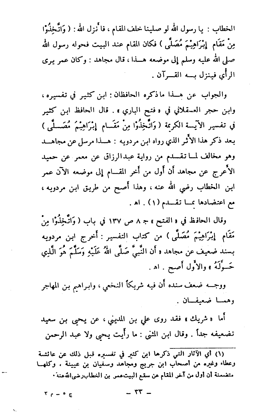 والجواب عن هذا ما ذكره الحافظان: ابن كثير في تفسيره، وابن حجر العسقلاني في "فتح الباري". قال الحافظ ابن كثير في تفسير الآية الكريمة (واتخذوا من مقام إبراهيم مصلى) بعد ذكر هذا الأثر الذي رواه ابن مردوية: هذا مرسل عن مجاهد وهو مخالف لما تقدم من رواية عبد الرزاق عن معمر عن حميد الأعرج عن مجاهد أن أول من أخر المقام إلى موضعه الآن عمر ابن الخطاب رضي الله عنه، وهذا أصح من طريق ابن مردويه، مع اعتضادها بما تقدم (¬1) . أهـ.