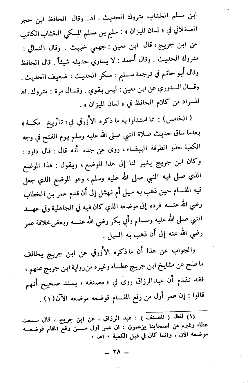 والجواب عن هذا أن ما ذكره الأزرقي عن ابن جريج يخالف ما صح عن مشايخ ابن جريج عطاء وغيره من رواية ابن جريج عنهم، فقد تقدم أن عبد الرزاق روى في "مصنفه" بسند صحيح أنهم قالوا: إن عمر أول من رفع المقام فوضعه موضعه الآن (¬1) .