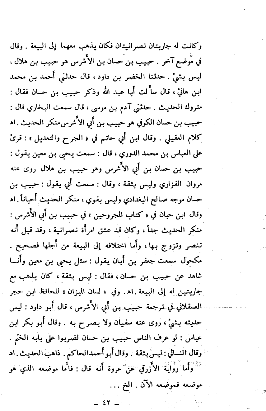 وكانت له جاريتان نصرانيتان فكان يذهب معهما إلى البيعة. وقال في موضع آخر. حبيب بن حسان بن الأشرس هو حبيب بن هلال، ليس بشيء. حدثنا الخضر بن داود، قال حدثني أحمد بن محمد ابن هانيء، قال سألت أبا عبد الله وذكر حبيب بن حسان فقال: متروك الحديث. حدثني آدم بن موسى، قال سمعت البخاري قال: حبيب بن حسان الكوفي هو حبيب بن أبي الأشرس منكر الحديث. أهـ كلام العقيلي. وقال ابن أبي حاتم في "الجرح والتعديل": قريء على العباس بن محمد الدوري، قال: سمعت يحيى بن معين يقول: حبيب بن حسان بن أبي الأشرس وهو حبيب بن هلال روى عنه مروان الفزاري وليس بثقة، وقال: سمعت أبي يقول: حبيب بن حسان موجه صالح البغدادي وليس بقوي, منكر الحديث أحيانًا. أهـ وقال ابن حبان في "كتاب المجروحين" في حبيب بن أبي الأشرس: منكر الحديث جدًا، وكان قد عشق امرأة نصرانية، وقد قيل أنه تنصر وتزوج بها، وأما اختلافه على البيعة من أجلها فصحيح. مكحول سمعت جعفر بن أبان يقول: سئل يحيى بن معين وأنا شاهد عن حبيب بن حسان، فقال: ليس بثقة، كان يذهب مع جاريتين له إلى البيعة. أهـ. وفي "لسان الميزان" للحافظ ابن حجر العسقلاني في ترجمة حبيب بن أبي الأشرس، قال أبوداود: ليس حديثه بشيء، روى عنه سفيان ولا يصرح به.