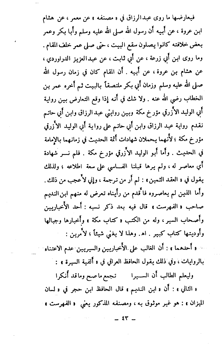فيعارضها ما روى عبد الرزاق في "مصنفه" عن معمر، عن هشام ابن عروة، عن أبيه أن رسول الله صلى الله عليه وسلم وأبا بكر وعمر بعض خلافته كانوا يصلون سقع البيت، حتى صلى عمر خلف المقام، وما روى ابن أبي زرعة، عن أبي ثابت، عن عبد العزيز الدراوردي، عن هشام بن عروة، عن أبيه. أن المقام كان في زمان رسول الله صلى الله عليه وسلم وزمان أبي بكر ملتصقًا بالبيت ثم أخره عمر بن الخطاب رضي الله عنه. ولاشك في أنه إذا وقع التعارض بين رواية أبي الوليد الأزرقي مؤرخ مكة وبين روايتي عبد الرزاق وابن أبي حاتم تقدم رواية عبد الرزاق وابن أبي حاتم على رواية أبي الوليد الأزرقي مؤرخ مكة؛ لأنهما يحملان شهادات أئمة الحديث في زمانهما بالإمامة في الحديث. وأما أبوالوليد الأزرقي مؤرخ مكة. فلم نر شهادة أي معاصر له، ولم يرها قبلنا الفاسي على سعة اطلاعه، ولذلك يقول في "العقد الثمين": لم أر من ترجمة، وإني لأعجب من ذلك. وأما الذين لم يعاصروه فأقدم من رأيناه تعرض له منهم ابن النديم صاحب "الفهرست" قال فيه بعد ذكر نسبه: أحد الأخباريين وأصحاب السير، وله من الكتب "كتاب مكة" وأخبارها وجبالها وأوديتها كتاب كبير. أهـ. وهذا لا يغني شيئًا؛ لأمرين: