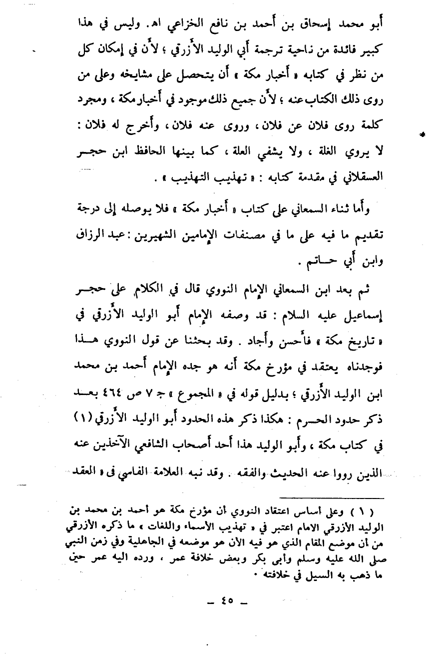 أبو محمد إسحاق بن أحمد بن نافع الخزاعي أهـ. وليس في هذا كبير فائدة من ناحية ترجمة أبي الوليد الأزرقي؛ لأن في إمكان كل من نظر في كتابه "أخبار مكة" أن يتحصل على مشايخه وعلى من روى ذلك الكتاب عنه؛ لأن جميع ذلك موجود في أخبار مكة، ومجرد كلمة روى فلان عن فلان، وروى عنه فلان، وأخرج له فلان: لا يروي الغلة، ولا يشفي العلة، كما بينها الحافظ ابن حجر العسقلاني في مقدمة كتابه: "تهذيب التهذيب".