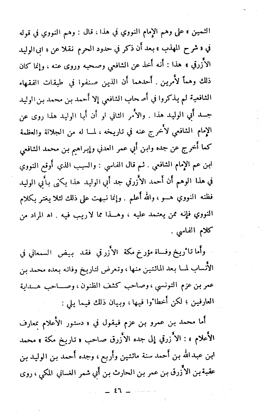 الثمين" على وهم الإمام النووي في هذا، قال: وهم النووي في قوله في "شرح المهذب" بعد أن ذكر في حدود الحرم نقلا عن "أبي الوليد الأزرقي" هذا: أنه أخذ عن الشافعي وصحبه وروي عنه، وإنما كان ذلك وهمًا لأمرين. أحدهما أن الذين صنفوا في طبقات الفقهاء الشافعية لم يذكروا في أصحاب الشافعي إلا أحمد بن محمد بن الوليد جد أبي الوليد هذا. والأمر الثاني أو أن أبا الوليد هذا روى عن الإمام الشافعي لأخرج عنه في تاريخه، لما له من الجلالة والعظمة كما أخرج عن جده وابن أبي عمر العدني وإبراهيم بن محمد الشافعي ابن عم الإمام الشافعي. ثم قال الفاسي: والسبب الذي أوقع النووي في هذا الوهم أن أحمد الأزرقي جد أبي الوليد هذا يكنى بأبي الوليد فظنه النووي هو، والله أعلم. وإنما نبهت على ذلك لئلا يغتر بكلام النووي فإنه ممن يعتمد عليه، وهذا مما لا ريب فيه. أهـ المراد من كلام الفاسي.