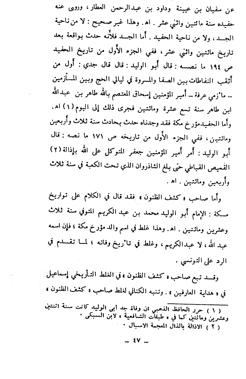 وأما صاحب "كشف الظنون" فقد قال في الكلام على تواريخ مسكة: الإمام أبوالوليد محمد بن عبد الكريم المتوفي سنة ثلاث وعشرين مائتين. أهـ. وهذا غلط في اسم والد مؤرخ مكة؛ فإن اسمه عبد الله، لا عبد الكريم، وغلط في تأريخ وفاته، لما تقدم في الرد على التونسي.