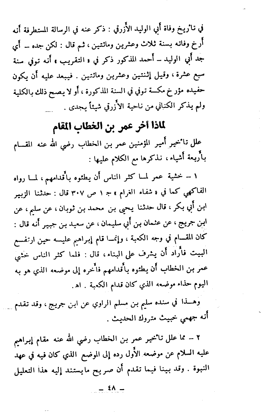 2- مما علل تأخير عمر بن الخطاب رضي الله عنه مقام إبراهيم عليه السلام عن موضعه الأول رده إلى الموضع الذي كان فيه في عهد النبوة. وقد بينا فيما تقدم أن صريح ما يستند إليه هذا التعليل