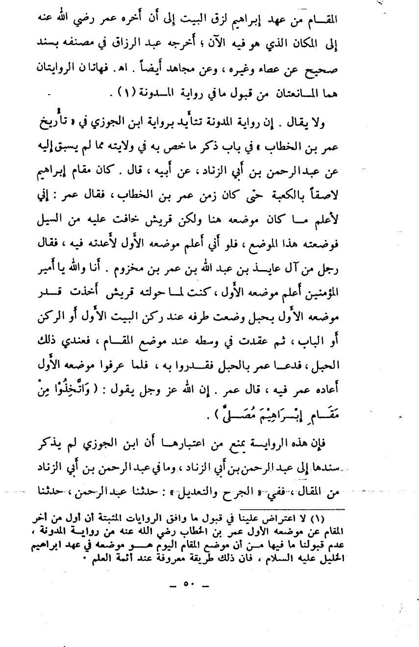 (¬1) لا اعتراض علينا في قبول ما وافق الروايات المثبتة أن أول من أخر المقام عن موضعه الأول عمر بن الخطاب رضي الله عنه من رواية المدونة، عدم قبولنا ما فيها من أن موضع المقام اليوم هو موضعه في عهد إبراهيم الخليل عليه السلام، فإن ذلك طريقة معروفة عند أئمة العلم.