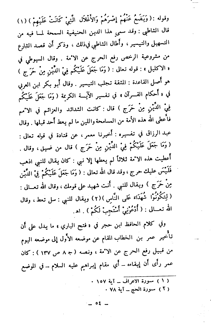 وقوله: (ويضع عنهم إصرهم والأغلال التي كانت عليهم) (¬1) قال الشاطبي: وقد سمي هذا الدين الحنيفية السمحة لما فيه من التسهيل والتيسير، وأطال الشاطبي في ذلك، وذكر أن قصد الشارع من مشروعية الرخص رفع الحرج عن الأمة. وقال السيوطي في "الأكليل": قوله تعالى: (وما جعل عليكم في الدين من حرج) هو أصل القاعدة: المشقة تجلب التيسير.