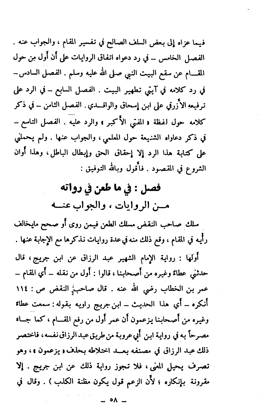 الفصل الخامس - في رد دعواه اتفاق الروايات على أن أول من حول المقام عن سقع البيت النبي صلى الله عليه وسلم.
