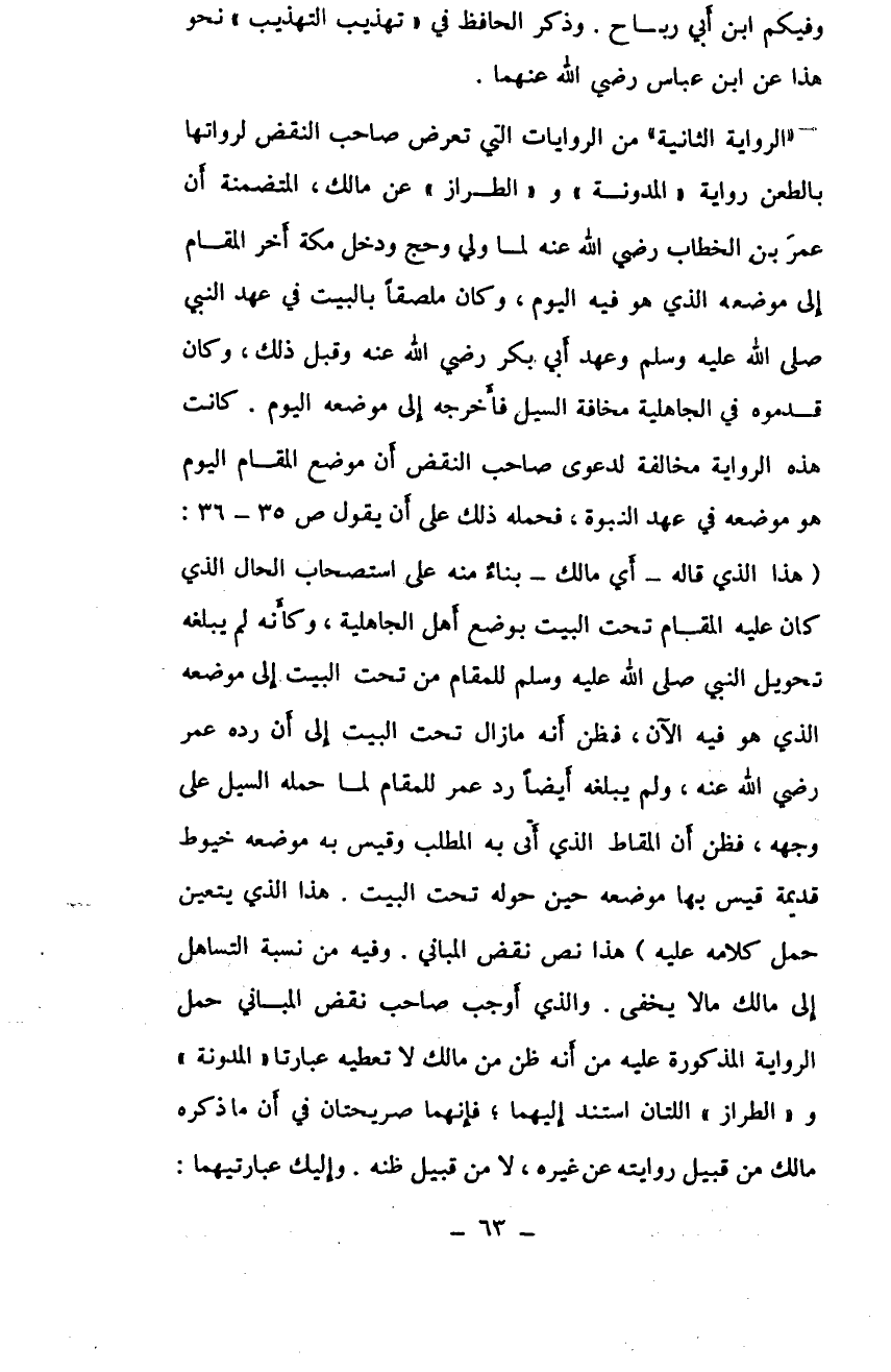 "الرواية الثانية" من الروايات التي تعرض صاحب النقض لرواتها بالطعن رواية "المدونة" و "الطراز" عن مالك، المتضمنة أن عمر بن الخطاب رضي الله عنه لما ولي وحج ودخل مكة أخر المقام إلى موضعه الذي هو فيه اليوم، وكان ملصقًا بالبيت في عهد النبي صلى الله عليه وسلم وعهد أبي بكر رضي الله عنه وقبل ذلك، وكان قدموه في الجاهلية مخافة السيل فأخرجه إلى موضعه اليوم. كانت هذه الرواية مخالفة لدعوى صاحب النقض أن موضع المقام اليوم هو موضعه في عهد النبوة، فحمله ذلك على أن يقول ص35-36: (هذا الذي قاله - أي مالك - بناءٌ منه على استصحاب الحال الذي كان عليه المقام تحت البيت بوضع أهل الجاهلية، وكأنه لم يبلغه تحويل النبي صلى الله عليه وسلم للمقام من تحت البيت إلى موضعه الذي هو فيه الآن، فظن أنه مازال تحت البيت إلى أن رده عمر رضي الله عنه، ولم يبلغه أيضًا رد عمر للمقام لما حمله السيل على وجهه، فظن أن المقاط الذي أتى به المطلب وقيس به موضعه خيوط قديمة قيس بها موضعه حين حوله تحت البيت. هذا الذي يتعين حمل كلامه عليه) هذا نص نقض المباني. وفيه من نسبة التساهل إلى مالك ما لا يخفى. والذي أوجب صاحب نقض المباني حمل الرواية المذكورة عليه من أنه ظن من مالك لا تعطيه عبارتا "المدونة" و "الطراز" اللتان استند إليهما؛ فإنهما صريحتان في أن ما ذكره مالك من قبيل روايته عن غيره، لا من قبيل ظنه. وإليك عبارتيهما: