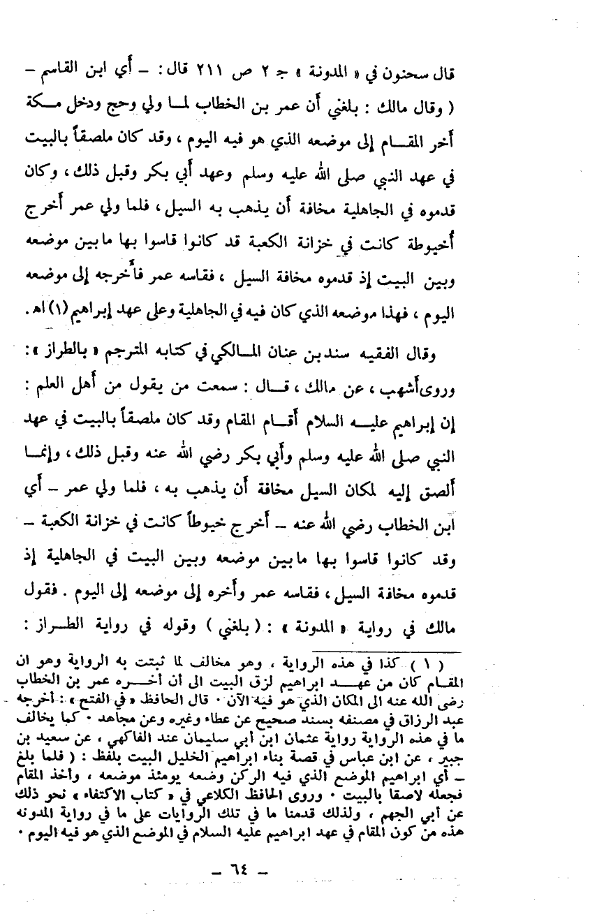 (¬1) كذا في هذه الرواية. وهو مخالف لما ثبتت به الرواية وهو أن المقام كان من عهد إبراهيم لزق البيت إلى أن أخره عمر بن الخطاب رضي الله عنه إلى المكان الذي هو فيه الآن. قال الحافظ "في الفتح": أخرجه عبد الرزاق في مصنفه بسند صحيح عن عطاء وغيره وعن مجاهد. كما يخالف ما في هذه الرواية رواية عثمان ابن أبي سليمان عند الفاكهي. عن سعيد بن جبير. عن ابن عباس في قصة بناء إبراهيم الخليل البيت بلفظ: (فلما بلغ - أي إبراهيم الموضع الذي فيه الركن وضعه يومئذ موضعه. وأخذ المقام فجعله لاصقًا بالبيت. وروى الحافظ الكلاعي في "كتاب الاكتفاء" نحو ذلك عن أبي الجهم. ولذلك قدمنا ما في تلك الروايات على ما في رواية المدونة هذه من كون المقام في عهد إبراهيم عليه السلام في الموضع الذي هو فيه اليوم.