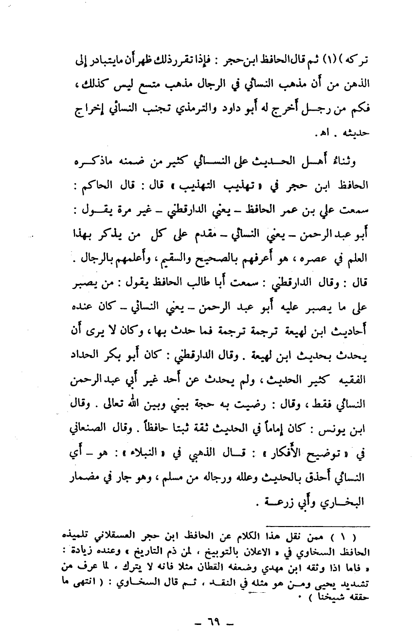 تركه) (¬1) ثم قال الحافظ ابن حجر: فإذا تقرر ذلك ظهر أن ما يتبادر إلى الذهن من أن مذهب النسائي في الرجال مذهب متسع ليس كذلك، فكم من رجل أخرج له أبوداود والترمذي تجنب النسائي إخراج حديثه. أهـ.