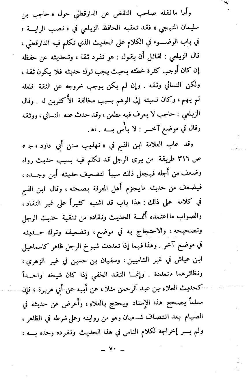 وأما ما نقله صاحب النقض عن الدارقطني حول "حاجب بن سليمان المنبجي" فقد تعقبه الحافظ الزيلعي في "نصب الراية" في باب الوضوء في الكلام على الحديث الذي تكلم فيه الدارقطني، قال الزيلعي: لقائل أن يقول: هو تفرد ثقة، وتحديثه عن حفظه إن كان أوجب كثرة خطئه بحيث يجب ترك حديثه فلا يكون ثقة، ولكن النسائي وثقه. وإن لم يكن يوجب خروجه عن الثقة فلعله لم يهم. وكان نسبته إلى الوهم بسبب مخالفة الأكثرين له. وقال الزيلعي: حاجب لا يعرف فيه مطعن. وقد حدث عنه النسائي. ووثقه وقال في موضع آخر: لا بأس به. أهـ.