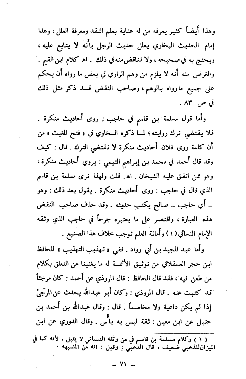 وهذا أيضًا كثير يعرفه من له عناية بعلم النقد ومعرفة العلل. وهذا إمام الحديث البخاري يعلل حديث الرجل بأنه لا يتابع عليه، ويحتج به في صحيحه، ولا تناقض منه في ذلك. أهـ كلام ابن القيم. والغرض منه أنه لا يلزم من وهم الراوي في بعض ما رواه أن يحكم على جميع ما رواه بالوهم، وصاحب النقض قد ذكر مثل ذلك في ص83.