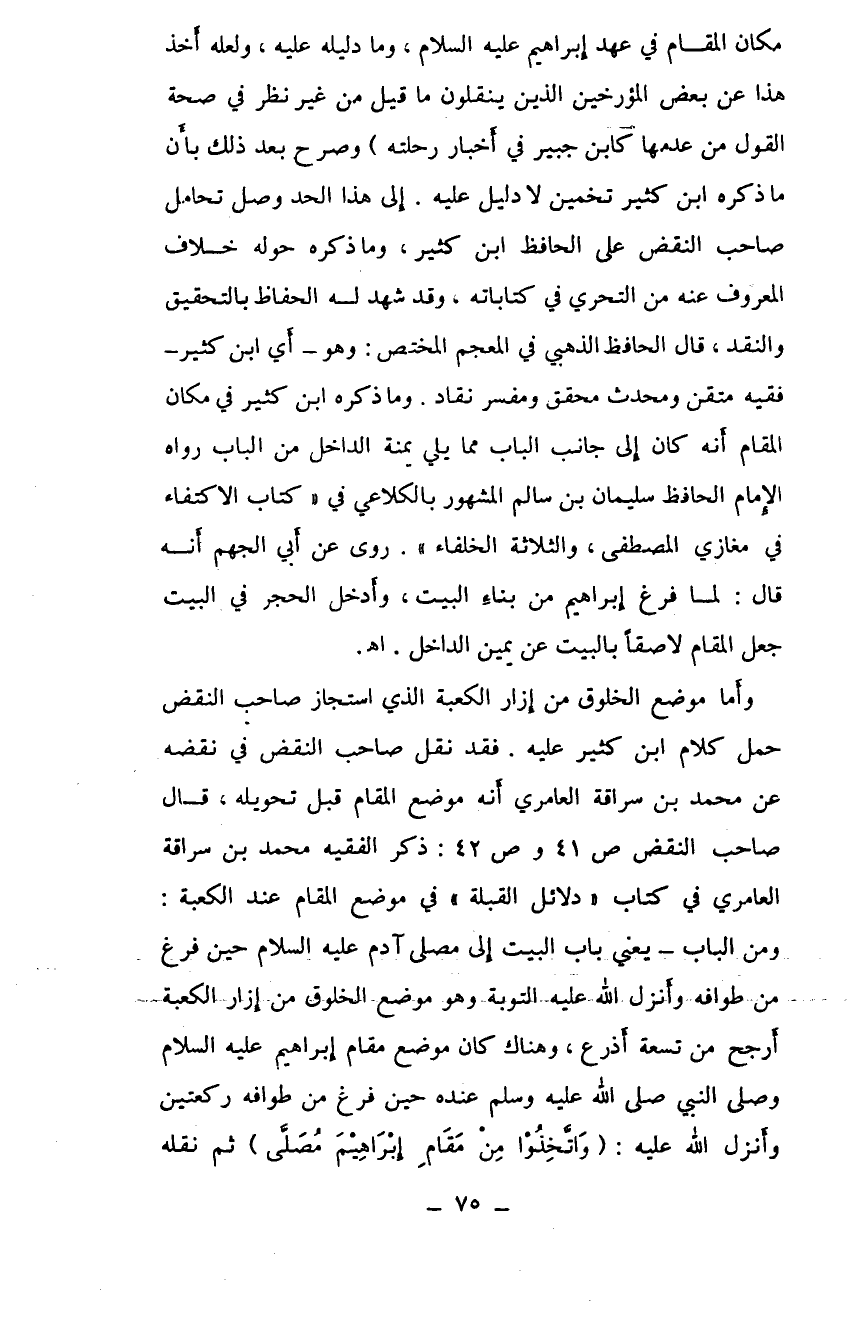 مكان المقام في عهد إبراهيم عليه السلام، وما دليله عليه، ولعله أخذ هذا عن بعض المؤرخين الذين ينقلون ما قيل من غير نظر في صحة القول من عدمها كابن جبير في أخبار رحلته) وصرح بعد ذلك بأن ما ذكره ابن كثير تخمين لا دليل عليه. إلى هذا الحد وصل تحامل صاحب النقض على الحافظ ابن كثير، وما ذكره حوله خلاف المعروف عنه من التحري في كتاباته. وقد شهد له الحافظ بالتحقيق والنقد. قال الحافظ الذهبي في المعجم المختص: وهو - أي ابن كثير - فقيه متقن ومحدث محقق ومفسر نقاد. وما ذكره ابن كثير في مكان المقام أنه كان إلى جانب الباب مما يلي يمنة الداخل من الباب رواه الإمام الحافظ سليمان بن سالم المشهور بالكلاعي في "كتاب الاكتفاء في مغازي المصطفى، والثلاثة الخلفاء". روى عن أبي الجهم أنه قال: لما فرغ إبراهيم من بناء البيت. وأدخل الحجر في البيت جعل المقام لاصقًا بالبيت عن يمين الداخل. أهـ.