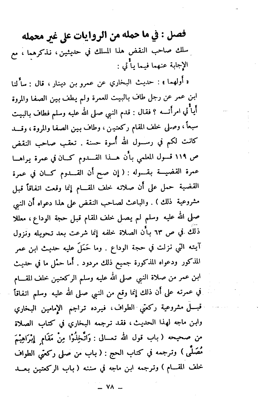 "أولهما": حديث البخاري عن عمرو بن دينار، قال: سألنا ابن عمر عن رجل طاف بالبيت للعمرة ولم يطف بين الصفا والمروة أيأتي امرأته؟ فقال: قدم النبي صلى الله عليه وسلم فطاف بالبيت سبعًا، وصلى خلف المقام ركعتين، وطاف بين الصفا والمروة، وقد كانت لكم في رسول الله أسوة حسنة. تعقب صاحب النقض ص119 قول المعلمي بأن هذا القدوم كان في عمرة يراها عمرة القضية بقوله: (إن صح أن القدوم كان في عمرة القضية حمل على أن صلاته خلف المقام إنما وقعت اتفاقًا قبل مشروعية ذلك) . والباعث لصاحب النقض على هذا دعواه أن النبي صلى الله عليه وسلم لم يصل خلف المقام قبل حجة الوداع، معللاً ذلك في ص63 بأن الصلاة خلفه إنما شرعت بعد تجويله ونزول آيته التي نزلت في حجة الوداع. وما حمل عليه حديث ابن عمر المذكور ودعواه المذكورة جميع ذلك مردود. أما حمل ما في حديث ابن عمر من صلاة النبي صلى الله عليه وسلم الركعتين خلف المقام في عمرته على أن ذلك إنما وقع من النبي صلى الله عليه وسلم اتفاقًا قبل مشروعية ركعتي الطواف. فيرده تراجم الإمامين البخاري وابن ماجه لهذا الحديث، فقد ترجمه البخاري في كتاب الصلاة من صحيحه (باب قول الله تعالى: واتخذوا من مقام إبراهيم مصلى) وترجمه في كتاب الحج: (باب من صلى ركعتين الطواف خلف المقام) وترجمه ابن ماجه في سننه (باب الركعتين بعد
