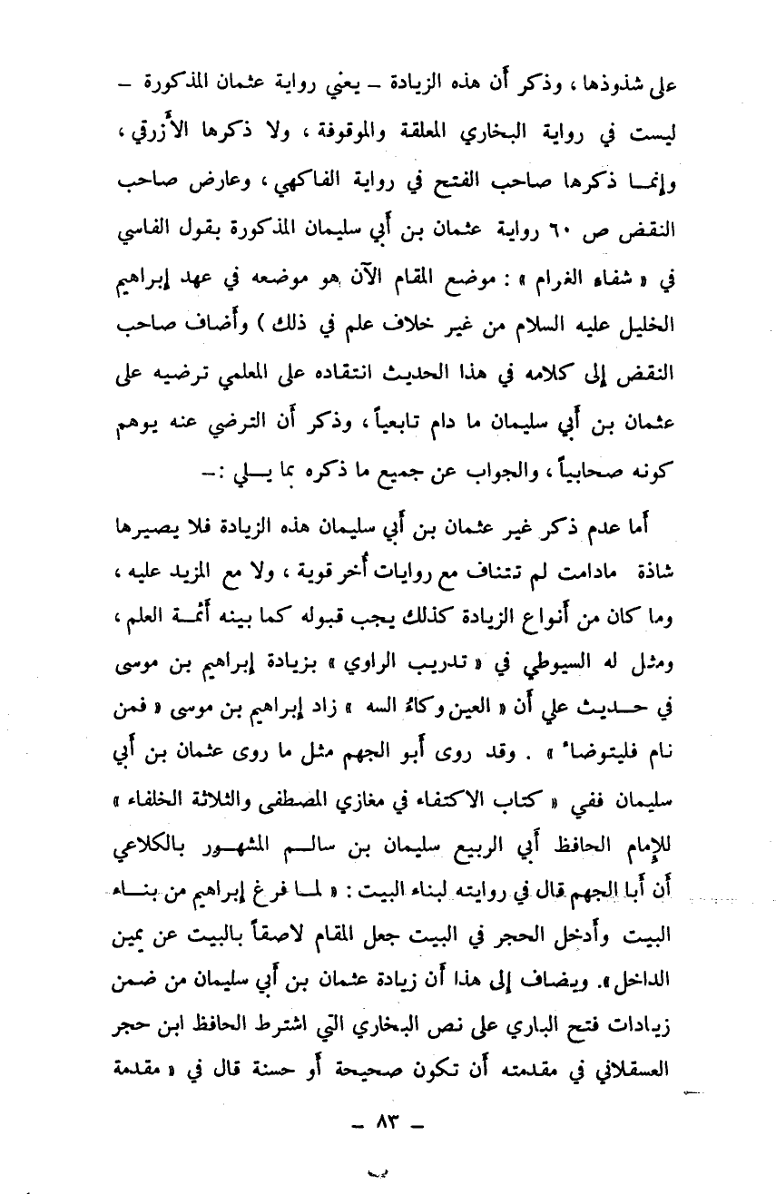 على شذوذها، وذكر أن هذه الزيادة - يعني رواية عثمان المذكورة - ليست في رواية البخاري المعلقة والموقوفة، ولا ذكرها الأزرقي، وإنما ذكرها صاحب الفتح في رواية الفاكهي، وعارض صاحب النقض ص60 رواية عثمان بن أبي سليمان المذكورة بقول الفاسي في "شفاء الغرام": موضع المقام الآن هو موضعه في عهد إبراهيم الخليل عليه السلام من غير خلاف علم في ذلك) وأضاف صاحب النقض إلى كلامه في هذا الحديث انتقاده على المعلمي ترضيه على عثمان بن أبي سليمان مادام تابعيًا، وذكر أن الترضي عنه يوهم كونه صحابيًا، والجواب عن جميع ما ذكره بما يلي: