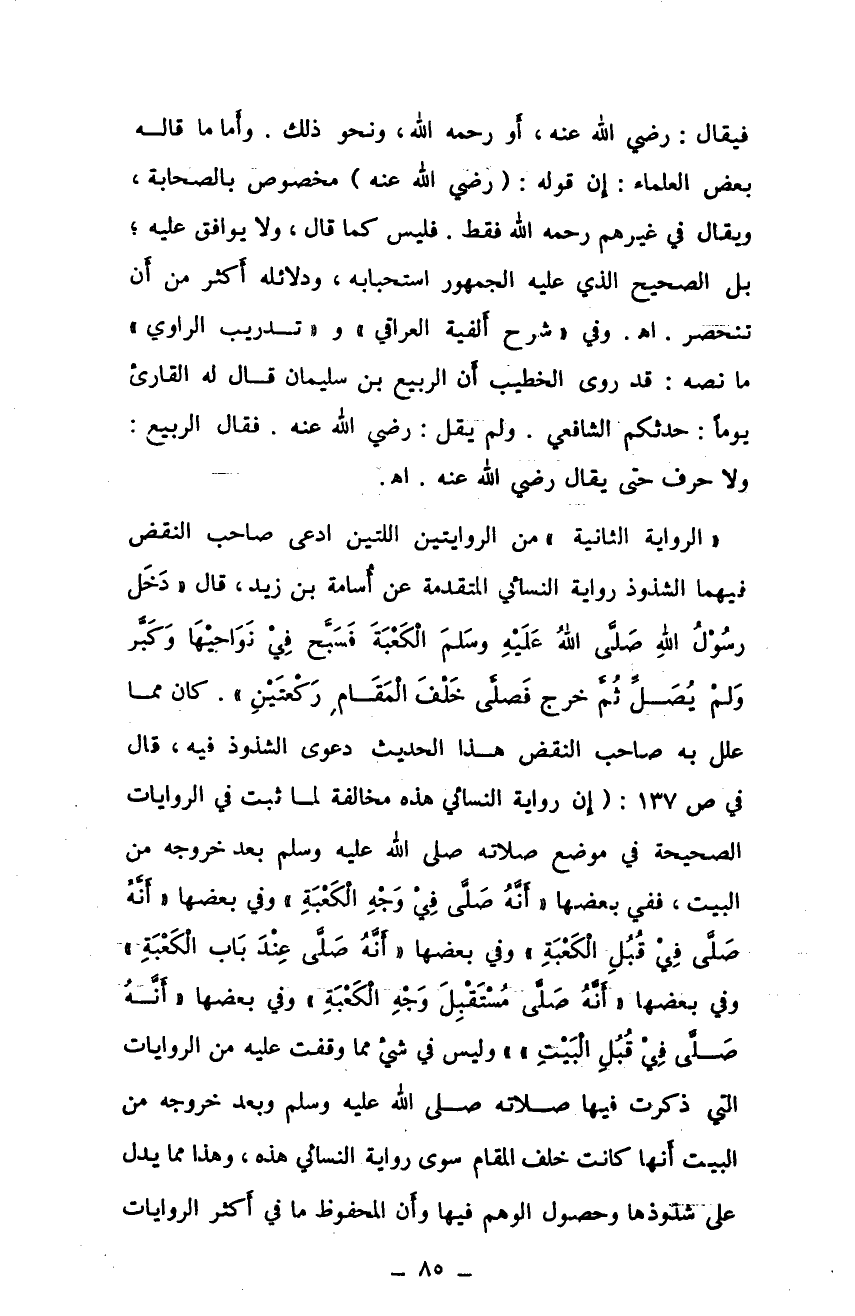 فيقال: رضي الله عنه، أو رحمه الله، ونحو ذلك. وأما ما قاله بعض العلماء: إن قوله: (رضي الله عنه) مخصوص بالصحابة، ويقال في غيرهم رحمه الله فقط. فليس كما قال، ولا يوافق عليه، بل الصحيح الذي عليه الجمهور استحبابه، ودلائله أكثر من أن تنحصر. أهـ. وفي "شرح ألفية العراقي" و "تدريب الراوي" ما نصه: قد روى الخطيب أن الربيع بن سليمان قال له القاريء يومًا: حدثكم الشافعي. ولم يقل: رضي الله عنه. فقال الربيع: ولا حرف حتى يقال رضي الله عنه. أهـ.