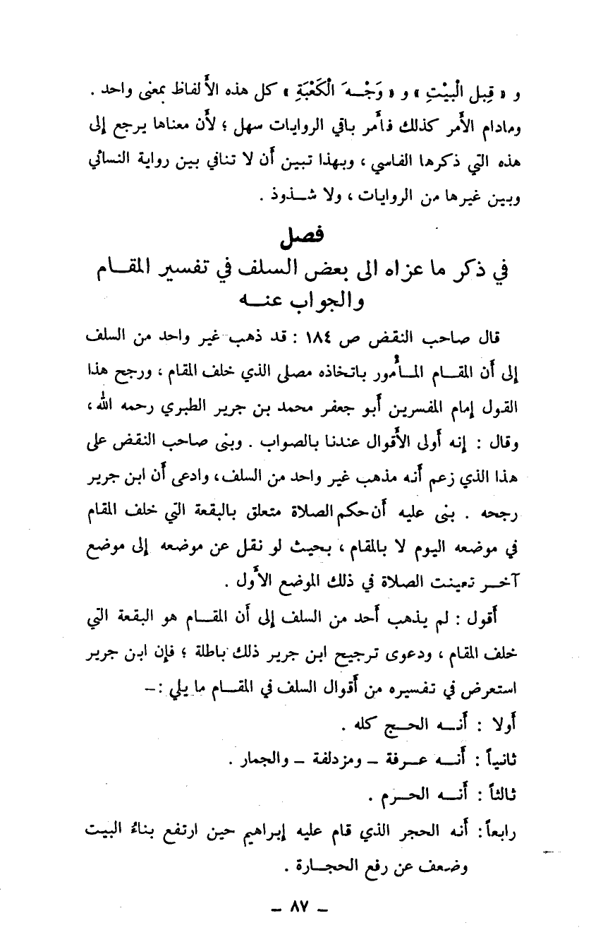قال صاحب النقض ص184: قد ذهب غير واحد من السلف إلى أن المقام المأمور باتخاذه مصلى الذي خلف المقام، ورجح هذا القول إمام المفسرين أبوجعفر محمد بن جرير الطبري رحمه الله، وقال: إنه أولى الأقوال عندنا بالصواب. وبنى صاحب النقض على هذا الذي زعم أنه مذهب غير واحد من السلف، وادعى أن ابن جرير رجحه. بنى عليه أن حكم الصلاة متعلق بالبقعة التي خلف المقام في موضعه اليوم لا بالمقام، بحيث لو نقل عن موضعه إلى موضع آخر تعينت الصلاة في ذلك الموضع الأول.