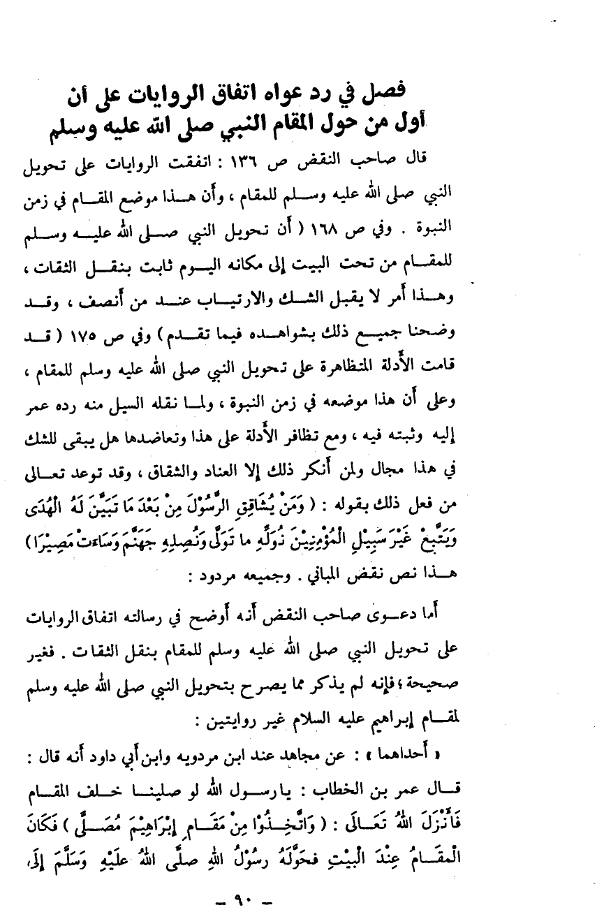 أما دعوى صاحب النقض أنه أوضح في رسالته اتفاق الروايات على تحويل النبي صلى الله عليه وسلم للمقام بنقل الثقات. فغير صحيحة؛ فإنه لم يذكر مما يصرح بتحويل النبي صلى الله عليه وسلم لمقام إبراهيم عليه السلام غير روايتين: