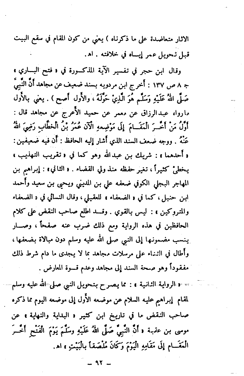 وقال ابن حجر في تفسير الآية المذكورة في "فتح الباري" ج8 ص137: أخرج ابن مردويه بسند ضعيف عن مجاهد أن النبي صلى الله عليه وسلم هو الذي حوله، والأول أصح) . يعني بالأول ما رواه عبد الرزاق عن معمر عن حميد الأعرج عن مجاهد قال: أول من أخر المقام إلى موضعه الآن عمر بن الخطاب رضي الله عنه. ووجه ضعف السند الذي أشار إليه الحافظ: أن فيه ضعيفين: "أحدهما": شريك بن عبد الله وهو كما في "تقريب التهذيب" يخطيء كثيرًا، تغير حفظه منذ ولي القضاء. "الثاني": إبراهيم بن المهاجر البجلي الكوفي ضعفه علي بن المديني ويحيى بن سعيد وأحمد ابن حنبل، كما في "الضعفاء" للمقيلي، وقال النسائي في "الضعفاء والمتروكين": ليس بالقوي. وقد اطلع صاحب النقض على كلام الحافظين في هذه الرواية ومع ذلك ضرب عنه صفحًا، وصار ينسب مضمونها إلى النبي صلى الله عليه وسلم دون مبالاة بضعفها، وأطال في الثناء على مرسلات مجاهد بما لا يجدى مادام شرط ذلك مفقودًا وهو صحة السند إلى مجاهد وعدم قوة المعارض.