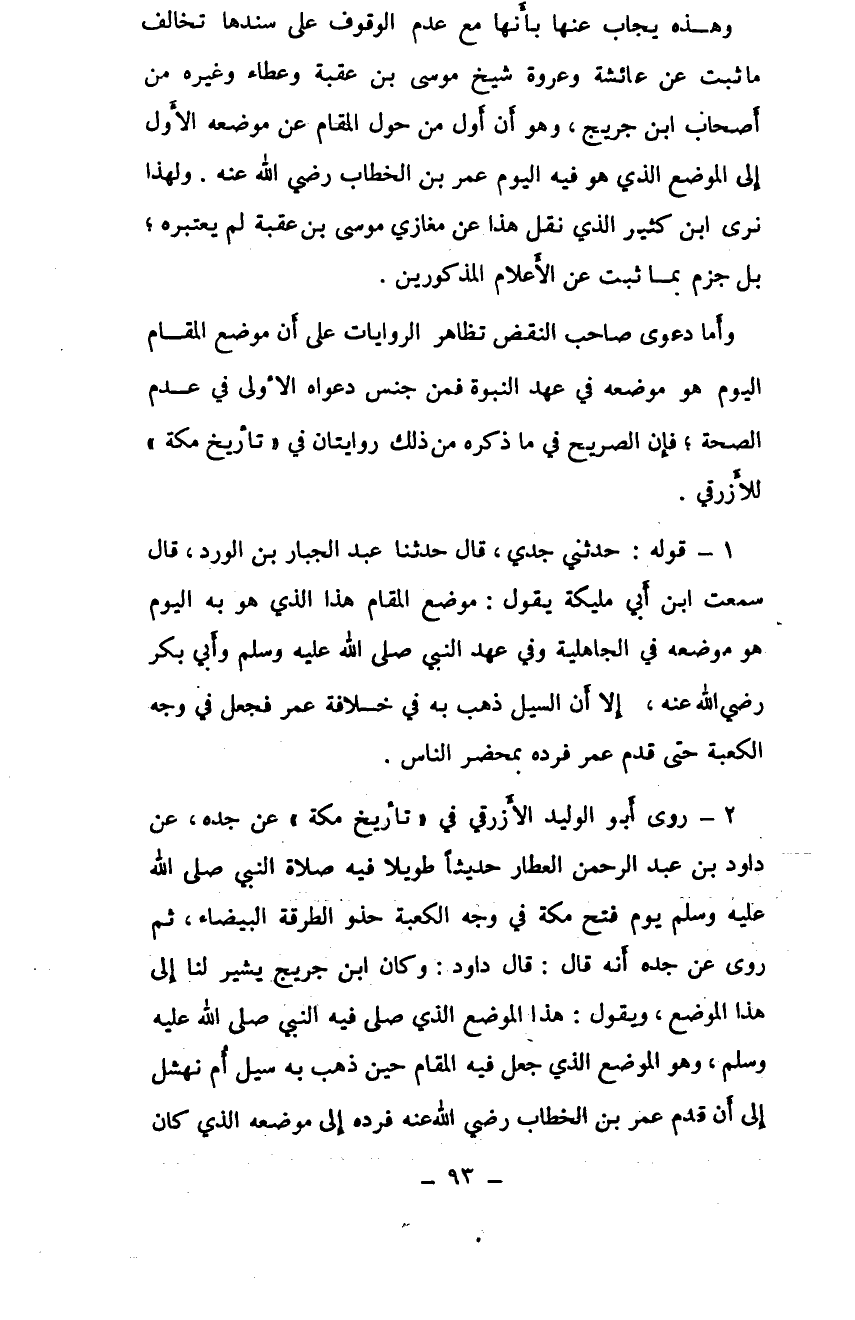 1- قوله: حدثني جدي، قال حدثنا عبد الجبار بن الورد، قال سمعت ابن أبي مليكة يقول: موضع المقام هذا الذي هو به اليوم هو موضعه في الجاهلية وفي عهد النبي صلى الله عليه وسلم وأبي بكر رضي الله عنه، إلا أن السيل ذهب به في خلافة عمر فجعل في وجه الكعبة حتى قدم عمر فرده بمحضر الناس.
