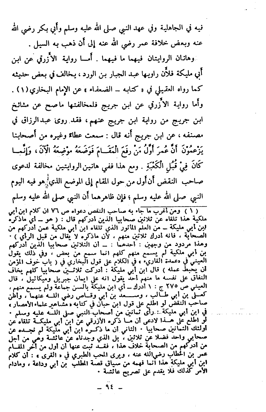 (¬1) ومن أغرب ما جاء به صاحب النقض دعواه ص76 أن كلام ابن أبي ملكية هذا تلقاه عن ثلاثين صحابيًا الذين أدركهم قال: (هو - أي ما ذكره ابن أبي مليكة - من العلم المأثور الذي تلقاه ابن أبي ملكية عمن أدركهم من الصحابة. فإنه أدرك ثلاثين منهم، لأن ما ذكره لا يقال من قبل الرأي) . وهذا مردود من وجهين: أحدهما: - أن الثلاثين صحابيا الذين أدركهم بن أبي ملكية لم يسمع منهم كلهم إنما سمع من بعض، وفي ذلك يقول العيني في "عمدة القاريء" في الكلام على قول البخاري في (باب خوف المؤمن أن يحيط عمله) قال ابن أبي مليكة: أدركت ثلاثين صحابيًا كلهم يخاف النفاق على نفسه ما منهم أحد يقول أنه على ايمان جبريل وميكائيل. قال العيني ص275 ج:1 أدرك - أي ابن مليكة بالسن جماعة ولم يسمع منهم، كعلي بن أبي طالب، وسعد بن أبي وقاص رضي الله عنهما، وأظن صاحب النقض لو اطلع على قول ابن حبان في كتابه "مشاهير علماء الأمصار" في ابن أبي مليكة: رأى ثمانين من أصحاب النبي صلى الله عليه وسلم، لو اطلع على هذا لادعى أن ما ذكرله الأزرقي عن ابن أبي مليكة تلقاه عن أولئك الثمانين صحابيًا. الثاني أن ما ذكره ابن أبي مليكة لم نجده عن صحابي واحد فضلا عن ثلاثين، بل الذي وجدناه عن عائشة وهي من أجل من أدركهم من الصحابة خلاف هذا، فقد ثبت عنها أن أول من أخر المقام عمر بن الخطاب رضي الله عنه، ويرى المحب الطبري في "القرى": أن كلام ابن أبي مليكة هذا إنما فهمه من سياق قصة المطلب بن أبي وداعة، ومادام الأمر كذلك فلا يقدم على تصريح عائشة.