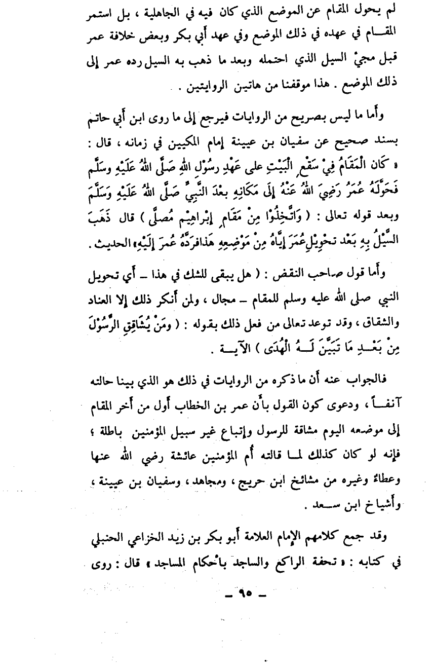 وأما ما ليس بصريح من الروايات فيرجع إلى ما روى ابن أبي حاتم بسند صحيح عن سفيان بن عيينة إمام المكيين في زمانه، قال: "كان المقام في سقع البيت على عهد رسول الله صلى الله عليه وسلم فحوله عمر رضي الله عنه إلى مكانه بعد النبي صلى الله عليه وسلم وبعد قوله تعالى: (واتخذوا من مقام إبراهيم مصلى) قال ذهب السيل به بعد تحويل عمر إياه من موضعه هذا فرده عمر إليه" الحديث.