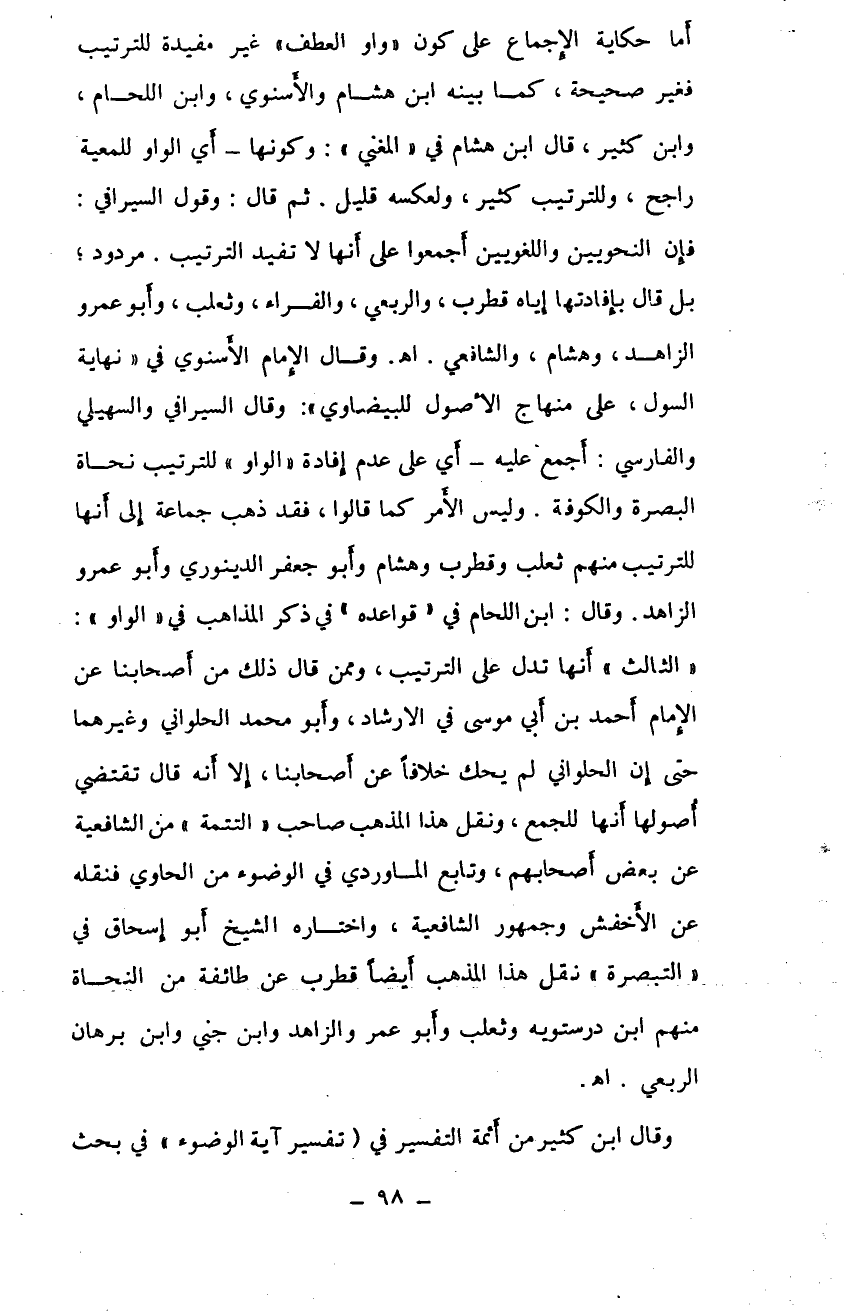 اما حكاية الإجماع على كون "واو العطف" غير مفيدة للترتيب فغير صحيحة. كما بينه ابن هشام والأسنوي، وابن اللحام، وابن كثير، قال ابن هشام في "المغني": وكونها - أي الواو السيرافي: فإن النحويين واللغويين أجمعوا على أنها لا تفيد الترتيب. مردود؛ بل قال بإفادتها إياه قطرب، والربعي، والفراء، وثعلب، وأبوعمرو الزاهد، وهشام، والشافعي. أهـ. وقال الإمام الأسنوي في "نهاية السول، على منهاج الأصول للبيضاوي": وقال السيرافي والسهيلي والفارسي: أجمع عليه - أي على عدم إفادة "الواو" للترتيب نحاة البصرة والكوفة. وليس الأمر كما قالوا، فقد ذهب جماعة إلى أنها للترتيب مهم ثعلب وقطرب وهشام وأبوجعفر الدينوري وأبوعمرو الزاهد. وقال: ابن اللحام في "قواعده" في ذكر المذاهب في "الواو": "الثالث" أنها تدل على الترتيب. وممن قال ذلك من أصحابنا عن الإمام أحمد بن أبي موسى في الارشاد. وأبومحمد الحلواني وغيرهما حتى إن الحلواني لم يحك خلافًا عن أصحابنا، إلا أنه قال تقتضي أصولها أنها للجمع، ونقل هذا المذهب صاحب "التتمة" من الشافعية عن بعض أصحابهم، وتابع الماوردي في الوضوء من الحاوي فنقله عن الأخفش وجمهور الشافعية: واختاره الشيخ أبوإسحاق في"التبصرة" نقل هذا المذهب أيضًا قطرب عن طائفة من النحاة منهم ابن درستويه وثعلب وأبوعمر والزاهد وابن جني وابن برهان الربعي. أهـ.