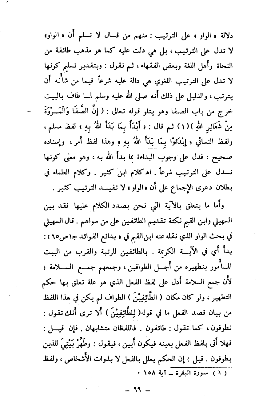 دلالة "الواو" على الترتيب: منهم من قال لا نسلم أن "الواو" لا تدل على الترتيب، بل هي دلت عليه كما هو مذهب طائفة من النحاة وأهل اللغة وبعض الفقهاء. ثم نقول: وبتقدير تسليم كونها لا تدل على الترتيب اللغوي هي دالة عليه شرعًا فيما من شأنه أن يترتب، والدليل على ذلك أنه صلى الله عليه وسلم لما طاف بالبيت خرج من باب الصفا وهو يتلو قوله تعالى: (إن الصفا والمروة من شعائر الله) (¬1) ثم قال: "أبدأ بما بدأ الله به" لفظ مسلم. ولفظ النسائي "إبدءوا بما بدأ الله به" وهذا لفظ أمر. وإسناده صحيح، فدل على وجوب البداءة بما بدأ الله به، وهو معنى كونها تدل على الترتيب شرعًا. أهـ كلام ابن كثير. وكلام العلماء في بطلان دعوى الإجماع على أن "الواو" لا تفيد الترتيب كثير.