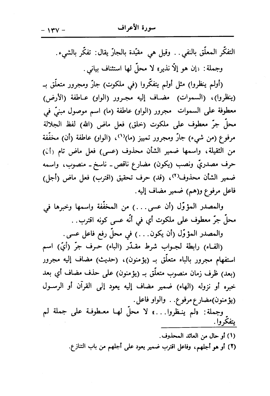 و (تم) ضمير فاعل (في سبيل) جار ومجرور متعلق بحال من فاعل ضربتم «1» ، (الله) لفظ الجلالة مضاف إليه (الفاء) رابطة لجواب الشرط (تبينوا) فعل أمر مبني على حذف النون ... و (الواو) فاعل (الواو) عاطفة (لا) ناهية جازمة (تقولوا) فعل مضارع مجزوم وعلامة الجزم حذف النون ... والواو فاعل (اللام) حرف جر (من) اسم موصول مبني في محل جر متعلق ب (تقولوا) ، (ألقى) فعل ماض مبني على الفتح المقدر على الألف، والفاعل ضمير مستتر تقديره هو (إلى) حرف جر و (كم) ضمير في محل جر متعلق ب (ألقى) ، (السلام) مفعول به منصوب (لست) فعل ماض جامد ناقص ... و (التاء) ضمير في محل رفع اسم ليس (مؤمنا) خبر ليس منصوب (تبتغون) مضارع مرفوع ... والواو فاعل (عرض) مفعول به منصوب (الحياة) مضاف إليه مجرور (الدنيا) نعت للحياة مجرور مثله وعلامة الجر الكسرة المقدرة على الألف (الفاء) تعليلية (عند) ظرف منصوب متعلق بخبر مقدم (الله) لفظ الجلالة مضاف إليه مجرور (مغانم) مبتدأ مؤخر مرفوع (كثيرة) نعت مرفوع. (الكاف) حرف جر و (ذا) اسم إشارة مبني في محل جر متعلق بمحذوف خبر مقدم للناقص و (اللام) للبعد و (الكاف) للخطاب (كنتم) فعل ماض ناقص مبني على السكون ... و (تم) ضمير اسم كان (من) حرف جر (قبل) اسم مبني على الضم في محل جر متعلق بالخبر المحذوف (الفاء) عاطفة (من) فعل ماض (الله) لفظ الجلالة فاعل مرفوع (عليكم) مثل إليكم متعلق ب (منّ) ، (الفاء) رابطة لجواب شرط مقدّر (تبيّنوا) مثل الأول (إنّ) حرف مشبه بالفعل (الله) لفظ الجلالة اسم إنّ منصوب (كان) فعل ماض ناقص، واسمه ضمير مستتر تقديره هو (الباء) حرف جرّ (ما) اسم موصول