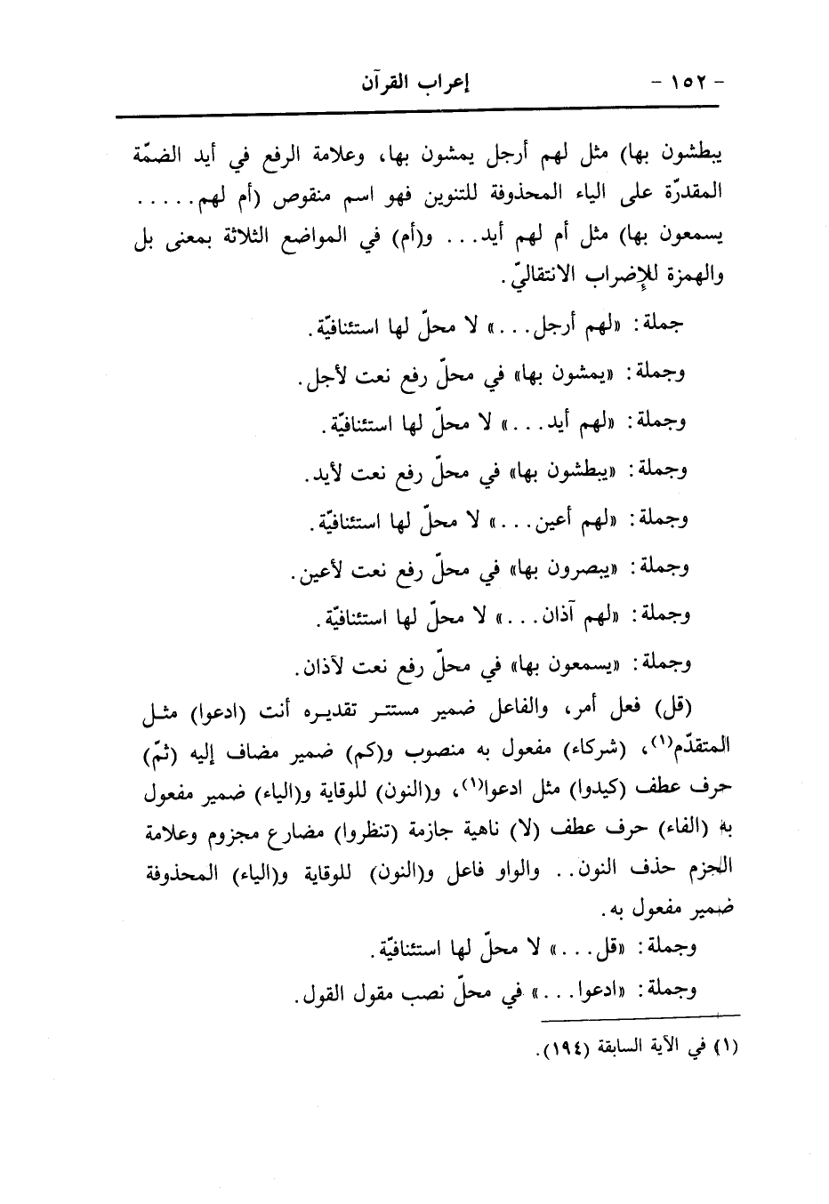 (الواو) استئنافية (لا) نافية للجنس (جناح) اسم لا مبني على الفتح في محل نصب (عليكم) مثل الأول متعلق بمحذوف خبر لا (إن) حرف شرط جازم (كان) فعل ماض ناقص «1» مبني على الفتح في محل جزم فعل الشرط (بكم) مثل عليكم متعلق بخبر كان (أذى) اسم كان مؤخر مرفوع وعلامة الرفع الضمة المقدرة على الألف (من مطر) جار ومجرور متعلق بنعت لأذى (أو) حرف عطف (كنتم) مثل كنت (مرضى) خبر منصوب وعلامة النصب الفتحة المقدرة على الألف (أن) حرف مصدري ونصب (تضعوا) مضارع منصوب وعلامة النصب حذف النون ... والواو فاعل (أسلحتكم) مثل الأول عامله تضعوا.