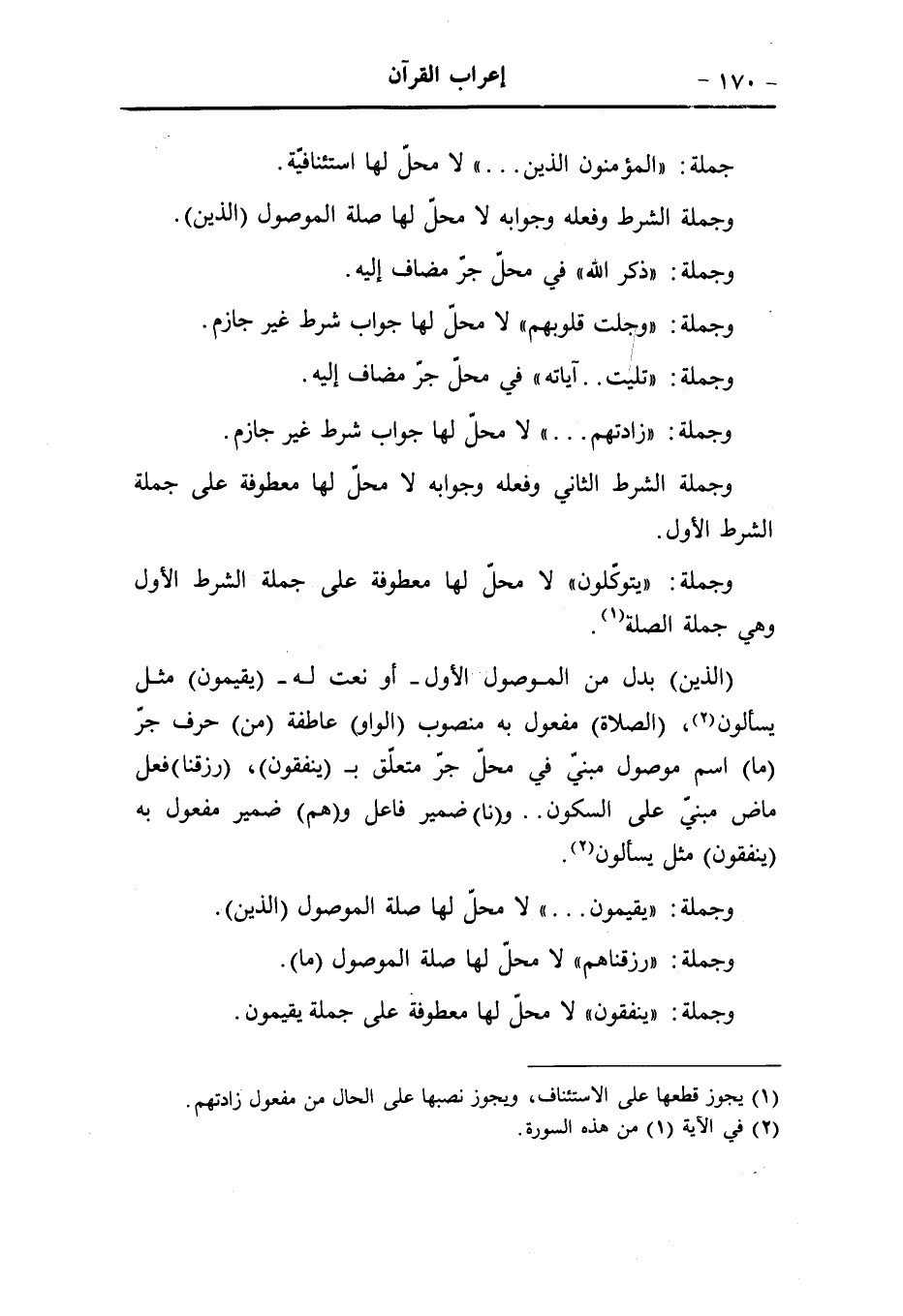 (الواو) عاطفة (من يشاقق الرسول) مثل من يفعل ذلك «1» ، (من بعد) جار ومجرور متعلق ب (يشاقق) ، (ما) حرف مصدري (تبيّن) فعل ماض (اللام) حرف جر و (الهاء) ضمير في محل جر متعلق ب (تبين) - أو بحال من الهدى- (الهدى) فاعل مرفوع وعلامة