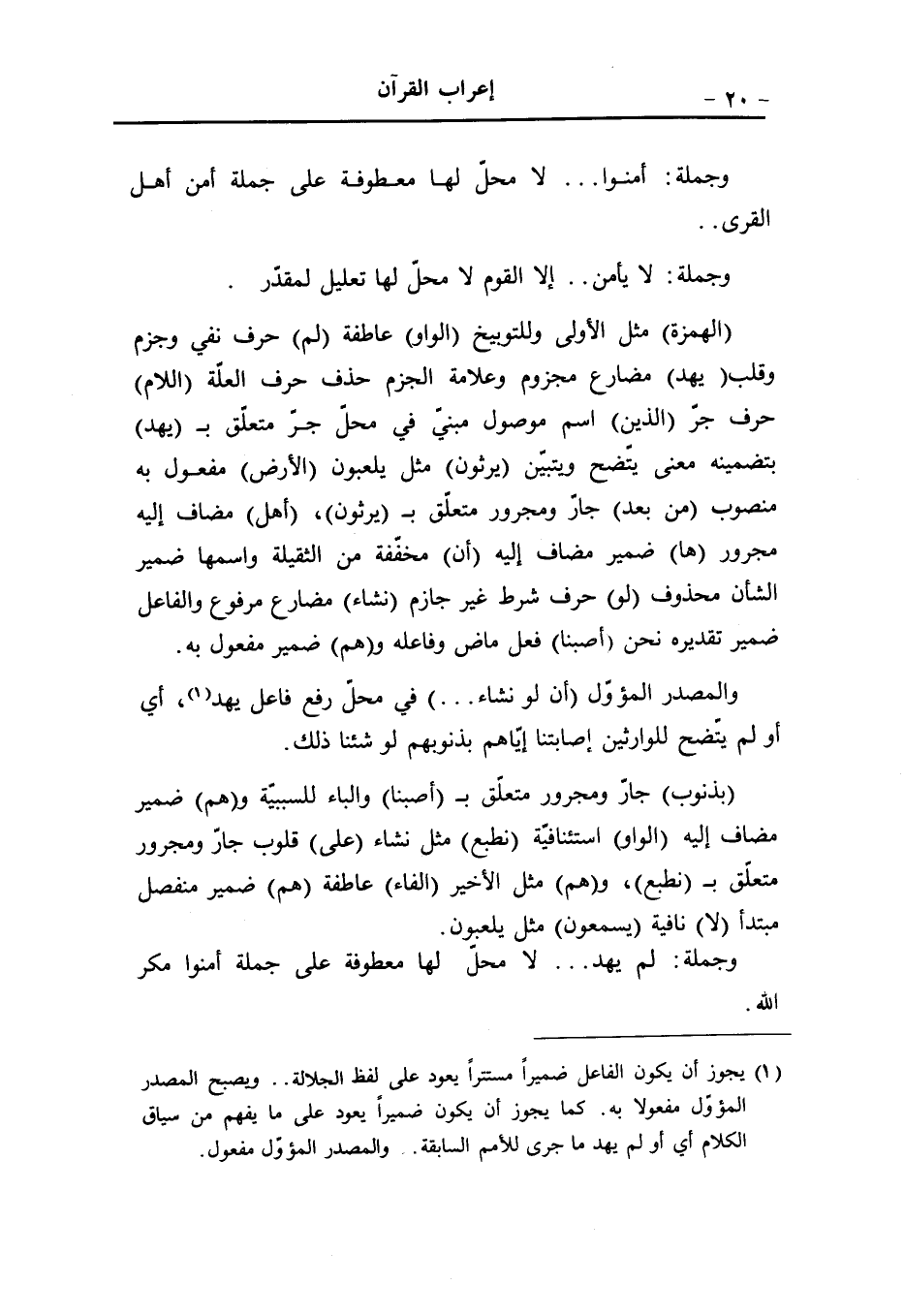 (الواو) عاطفة (من) اسم شرط جازم مبني في محل رفع مبتدأ (يفعل) مضارع مجزوم فعل الشرط، والفاعل ضمير مستتر تقديره هو (ذا) اسم إشارة مبني في محل نصب مفعول به و (اللام) للبعد و (الكاف) للخطاب (عدوانا) مفعول لأجله منصوب «1» ، (الواو) عاطفة (ظلما) معطوف على (عدوانا) منصوب مثله (الفاء) رابطة لجواب الشرط (سوف) حرف استقبال (نصلي) مضارع مرفوع وعلامة الرفع الضمة المقدّرة على الياء و (الهاء) ضمير مفعول به أول، والفاعل ضمير مستتر تقديره نحن للتعظيم (نارا) مفعول به ثان منصوب (الواو) استئنافية (كان) ماض ناقص (ذلك) مثل الأول اسم كان والإشارة إلى الإصلاء (على الله) جار ومجرور متعلق ب (يسيرا) وهو خبر كان منصوب.