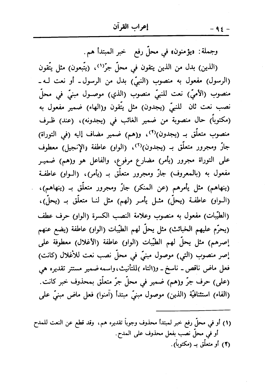 (الواو) عاطفة (ما) اسم استفهام مبني في محل رفع مبتدأ (اللام) حرف جر و (كم) ضمير مبني في محل جر متعلق بخبر ما (لا) نافية (تقاتلون) مضارع مرفوع ... والواو فاعل (في سبيل الله) مر إعرابها آنفا «1» ، (الواو) عاطفة (المستضعفين) معطوف على سبيل مجرور مثله، على حذف مضاف أي تخليص المستضعفين، وعلامة الجر الياء (من الرجال) جار ومجرور متعلق بحال من المستضعفين (النساء، الولدان) اسمان معطوفان على الرجال بحرفي العطف مجروران مثله (الذين) اسم موصول مبني في محل جر نعت للمستضعفين (يقولون) مثل تقاتلون (ربّ) منادى مضاف منصوب و (نا) ضمير مضاف إليه (أخرجنا) فعل أمر دعاء ... و (نا) مفعول به، والفاعل ضمير مستتر تقديره أنت (من) حرف جر (ها) حرف تنبيه (ذه) اسم إشارة مبني في محل جر متعلق ب (أخرجنا) ، (القرية) بدل من ذه- أو نعت له- تبعه في الجر (الظالم) نعت سببي للقرية مجرور مثله (أهل) فاعل لاسم الفاعل الظالم مرفوع و (ها) ضمير مضاف إليه (الواو) عاطفة (اجعل) مثل خرجه (لنا) مثل لكم متعلق ب (اجعل) «2» ، (من) حرف جر (لدن) اسم مبني على السكون في محل جر متعلق بحال من (وليّا) «3» ، و (الكاف) ضمير