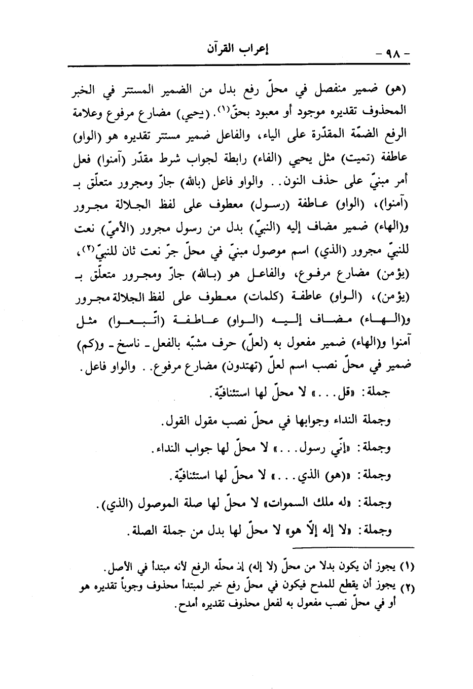 (الهمزة) للاستفهام التعجّبيّ (تر) مضارع مجزوم، والفاعل ضمير مستتر تقديره أنت (إلى) حرف جر (الذين) اسم موصول مبني في محل جر متعلق ب (تر) بتضمينه معنى تنظر (قيل) فعل ماض مبني للمجهول (اللام) حرف جر و (هم) ضمير في محل جر متعلق ب (قيل) ، (كفّوا) فعل أمر مبني على حذف النون ... والواو فاعل (أيدي) مفعول به منصوب و (كم) ضمير مضاف إليه (الواو) عاطفة (أقيموا الصلاة) مثل كفّوا أيديكم ومثلها (آتوا الزكاة) . (الفاء) استئنافية (لما) ظرف بمعنى حين متضمن معنى الشرط متعلق بمضمون معنى الجواب أي ظهرت خشيتهم (كتب) مثل قيل (عليهم) مثل لهم متعلق ب (كتب) ، (القتال) نائب فاعل مرفوع (إذا) فجائية لا عمل لها (فريق) مبتدأ مرفوع «1» ، (منهم) مثل لهم متعلق بنعت لفريق (يخشون) مضارع مرفوع والواو فاعل (الناس) مفعول به منصوب (كخشية) جار ومجرور متعلق بمحذوف مفعول مطلق (الله) لفظ الجلالة مضاف إليه مجرور (أو) حرف عطف (أشد) معطوف على خشية مجرور مثله وعلامة الجر الفتحة عوضا من الكسرة لأنه ممنوع من الصرف للوصفية ووزن أفعل «2» ،