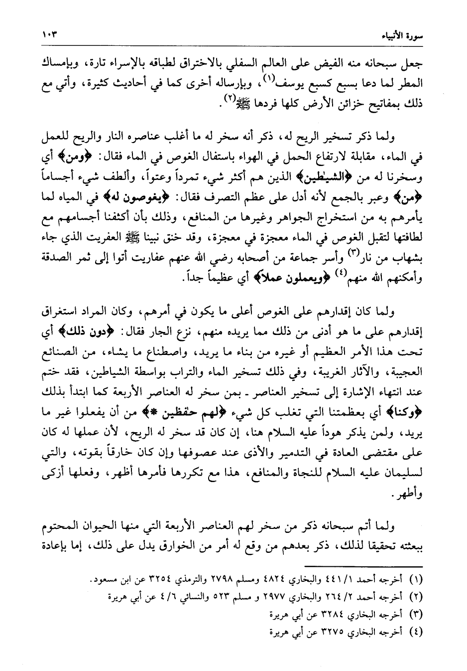 ولما ذكر تسخير اليح له ، ذكر أنه سخر له مأغلبعناصره النار والريح للعمل في الماء ، مقابلة لارتفاع الحمل في الهواء باستفال الغوص في الماء فقال : ( ومن ) أي وسخرنا له من ) الشياطين ( الذين هم أكثر شيء تمرداً وعتواً ، وألطف شيء أجساماً ) من ( وعبر بالجمع لأنه أدل على عظم التصرف فقال : ( يغوصون له ( في المياه لما يأمرهم به من استخراج الجواهر وغيرها من المنافع ، وذلك بأن أكثفنا أجسامهم مع لطافتها لتقبل الغوص في الماء معجزة في معجزة ، وقد خنق نبينا محمد ( صلى الله عليه وسلم ) العفريت الذي جاء بشهاب من نار وأسر جماعة من أصحابه رضي الله عنهم عفاريت أتوا إلى ثمر الصدقة وأمكنهم الله منهم ) ويعملون عملاً ) أي عظيماً جداً .