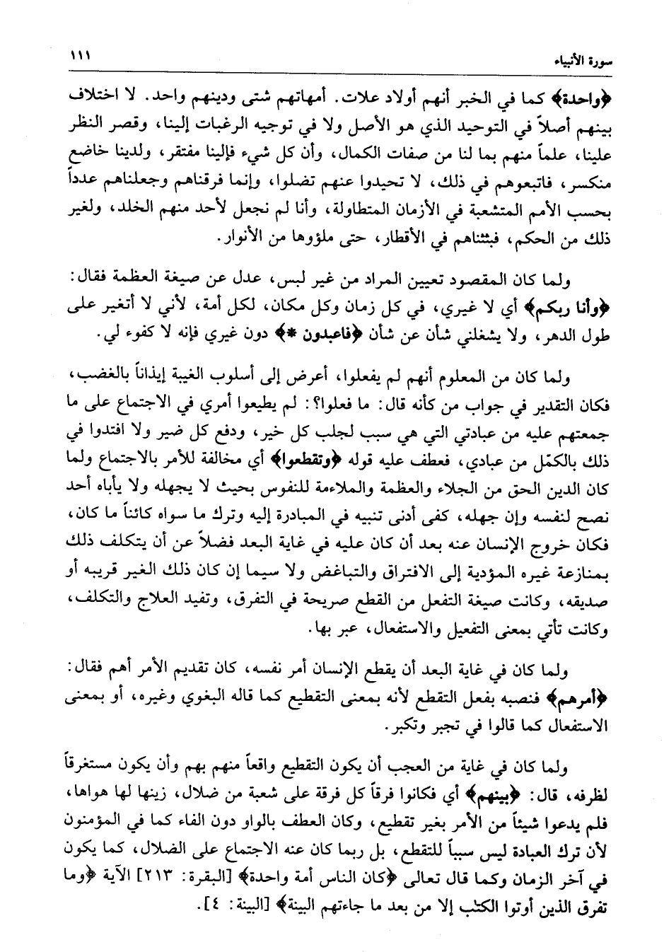 ولما كان البعد أن يقطع الإنسان أمر نفسه ، كان تقديم الأمر أهم فقال : ( أمرهم ( فنصبه بفعل التقطع لأنه بمعنى التقطيع واقعاً منهم بهم وأن يكون مستغرقاً لظرفه ، قال : ( بينهم ) أي فكانوا فرقاً كل فرقة على شعبة من ضلال ، زينها لها هواها ، فلم يدعوا شيئاً من الأمر بغير تقطيع ، وكان العطف بالواو دون الفاء كما في المؤمنون لأن ترك العبادة ليس سبباً للتقطع ، بل ربما كان عنه الاجتماع على الضلال ، كما يكون في آخر الزمان وكما قال تعالى