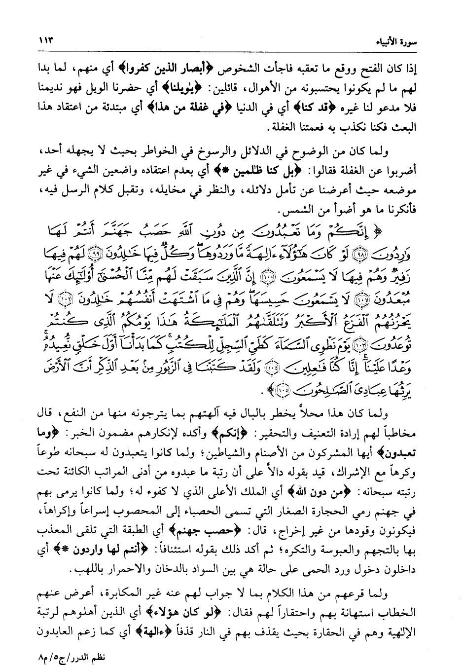 ) إِنَّكُمْ وَمَا تَعْبُدُونَ مِن دُونِ اللَّهِ حَصَبُ جَهَنَّمَ أَنتُمْ لَهَا وَارِدُونَ لَوْ كَانَ هَؤُلاءِ آلِهَةً مَّا وَرَدُوهَا وَكُلٌّ فِيهَا خَالِدُونَ لَهُمْ فِيهَا زَفِيرٌ وَهُمْ فِيهَا لاَ يَسْمَعُونَ إِنَّ الَّذِينَ سَبَقَتْ لَهُمْ مِّنَّا الْحُسْنَى أُوْلَئِكَ عَنْهَا مُبْعَدُونَ لاَ يَسْمَعُونَ حَسِيَسَهَا وَهُمْ فِي مَا اشْتَهَتْ أَنفُسُهُمْ خَالِدُونَ لاَ يَحْزُنُهُمُ الْفَزَعُ الأَكْبَرُ وَتَتَلَقَّاهُمُ الْمَلاَئِكَةُ هَذَا يَوْمُكُمُ الَّذِي كُنتُمْ تُوعَدُونَ يَوْمَ نَطْوِي السَّمَآءَ كَطَيِّ السِّجِلِّ لِلْكُتُبِ كَمَا بَدَأْنَآ أَوَّلَ خَلْقٍ نُّعِيدُهُ وَعْداً عَلَيْنَآ إِنَّا كُنَّا فَاعِلِينَ وَلَقَدْ كَتَبْنَا فِي الزَّبُورِ مِن بَعْدِ الذِّكْرِ أَنَّ الأَرْضَ يَرِثُهَا عِبَادِيَ الصَّالِحُونَ ( ( )