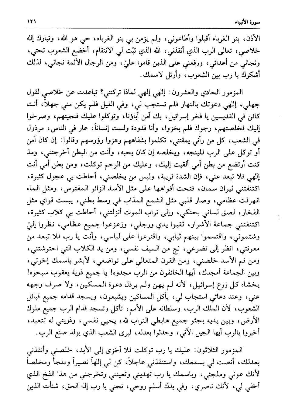 المزمور الحادي والعشرون : إلهي إلهي لماذا تركتني ؟ تباعدت عن خلاصي لقول جهلي ، غلهي دعوتك فلم تستجب لي ، وفي الليل فلم يكن مني جهلاً ، أنت كائن في القديسين يا فخر إسرائيل ، بك آمن آباؤنا ، وتوكلوا عليك فنجيتهم ، وصرخوا إليك فخلصتهم ، رجوك فلم يخزوا ، وأنا فدودة ولست إنساناً ، عار في الناس ، مرذول في الشعب ، كل من رآني يمقتني ، تكلموا بشفاههم وهزوا رؤوسهم وقالوا : أن كان آمن أو توكل على الرب فلينجه ، ويخلصه إ ، كان يحبه ، وأنت من البطن أخرجتني ، ومذ كنت أرتضع من بطن أمي القيت إليك ، وعليك من الرحم توكلت ، ومن بطن أمي أنت إلهي فلا تبعد عني ، فإن الشدة قريبة ، وليس من يخلصني ، أحاطت بي عجول كثيرة ، اكتنفني ثيران السمانن ، فتحت أفواهها على مثل الأسد الزائر المفترس ، ومثل الماء انهرقت عظامي ، وصار قلبي مثل الشمع المذاب في وسط بطني ، يبست قواي مثل الفخار ، لصق لساني بحنكي 4 ، وإلى تراب الموت أنزلتني ، أجحاطت بي كلاب كثيرة ، اكتنفتي جماعة الأشرار ، ثقبوا يدي ورجلي ، وزعزعوا جميع عظامي ، نظروا إليّ وشمتوني ، واقتسموا بينهم ثيابي ، واقترعوا على لباسي ، وأنت يا رب فلا تبعد من معونتي ، انظر إلى تضرعي ، نج من السيف نفسي ، ومن يد الكلاب التي احتوشتني ، ومن فم الأسد خلصني ، ومنالقرن المتعالي على تواضعي ، لأبشر باسمك إخوتي ، وبين الجماعة أمجدك ، أيها الخائفون من الرب مجدوه يا جميع ذرية يعقوب سبحوه يخشاه كل زرع إسرائيل ، لأنه لم يهن ولم يرذل دعوة المسكين ، ولا صرف وجهه عني ، وعند دعائي استجاب لي ، يأكل المساكين ويشبعون ، ويسجد قدامه جميع قبائل الشعوب ، لأنه الملك الرب ، وسلطانه على الأمم ، تأكل وتسجد قدام الرب جميع ملوك الأرض ، وبين يديه يجثو جميع هابطي التراب لله ، يحيي نفسي ، وذريتي لع تتعبد ، أخبروا بالرب أيها الجيل الآتي ، وحدثوا بعدله ، ليرى الشعب الذي يولد صنع الرب .